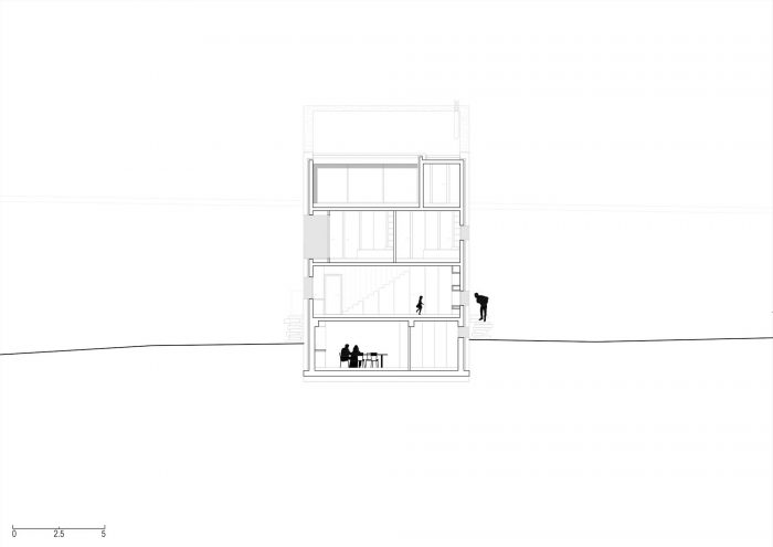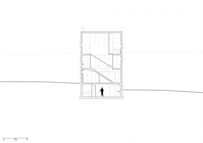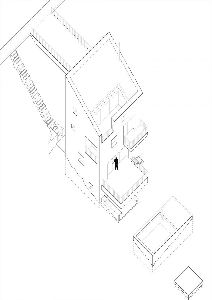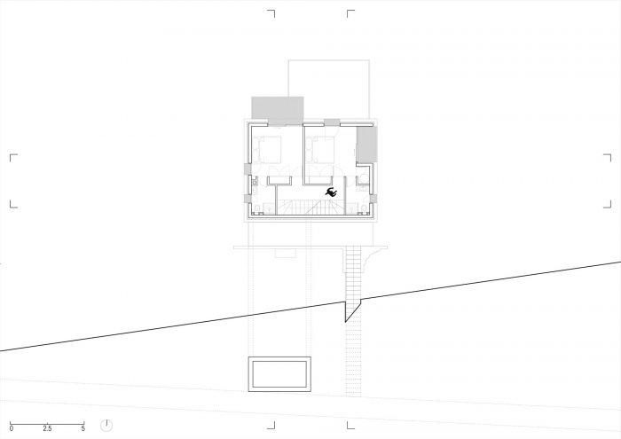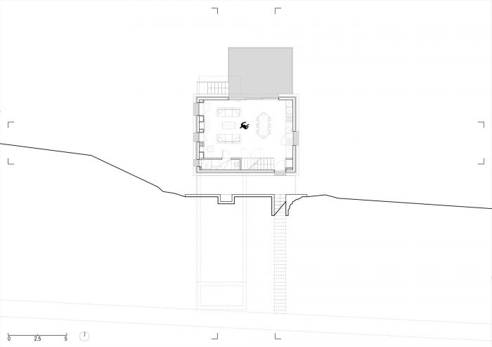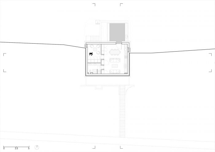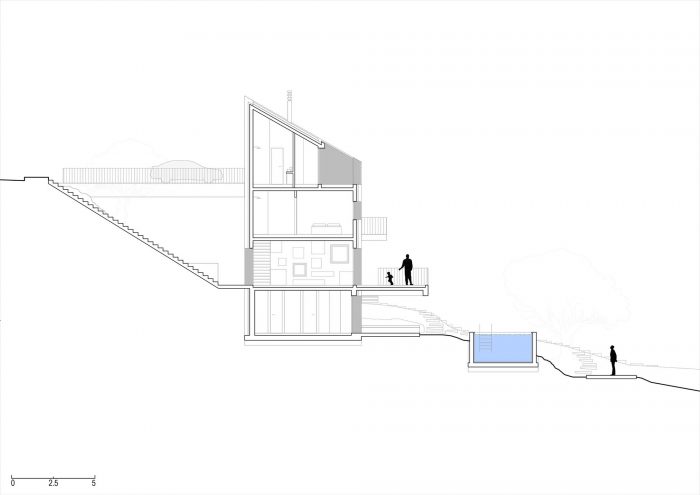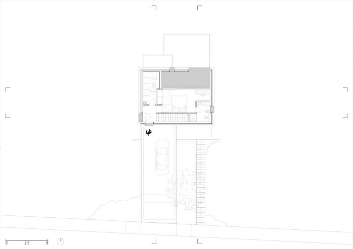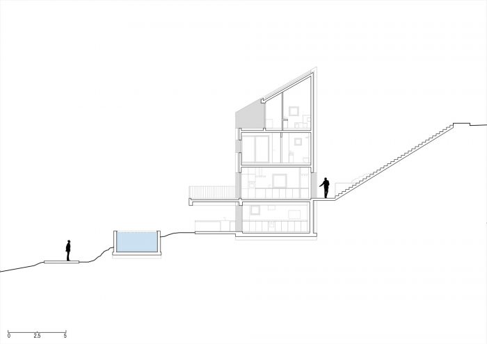 在它的南边,建筑地块的两侧是一条铺设好的道路。由于该地块所处的坡度特别大,再加上建筑法规要求房屋与道路有一定的距离,因此建造了一座混凝土桥作为通往房屋的唯一车道。这个面向道路的南部立面是完全空白的,其结构只剩下两个开口:房子的主入口,由桥来强调,另一个是侧面入口,由雕刻在陡峭地形上的长的外部楼梯来强调。