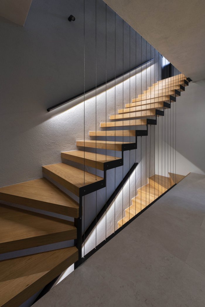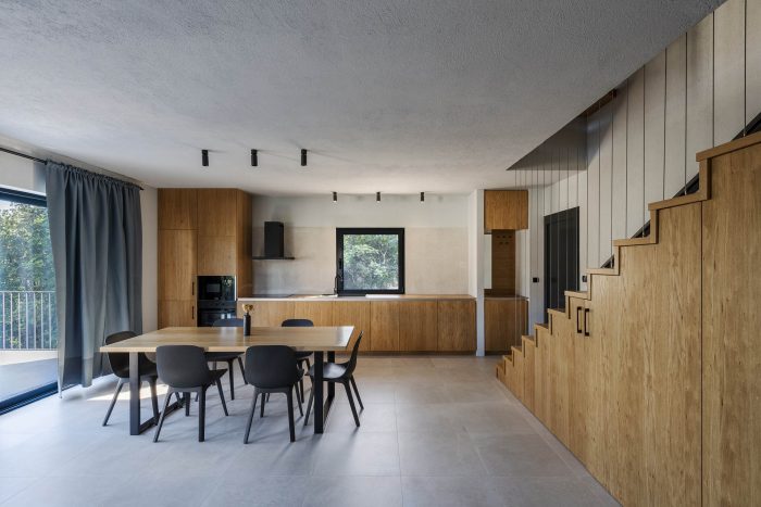 The enclosed space under the staircase hides an inbuilt bathroom and storage while the open kitchen, living, and dining room give access to the spacious console terrace, the focal point of summer activities. The terrace, embedded in abundant vegetation, makes use of the shadow and the shade that the house provides. The bottom floor of the house includes wine storage and it opens onto a shaded summer kitchen placed under the console of the upper-floor terrace. The space becomes an intimate garden terrace, adjoined by a monolithic concrete pool, surrounded by the lush carob trees which also serve as a screen hiding the terrace from the outside.