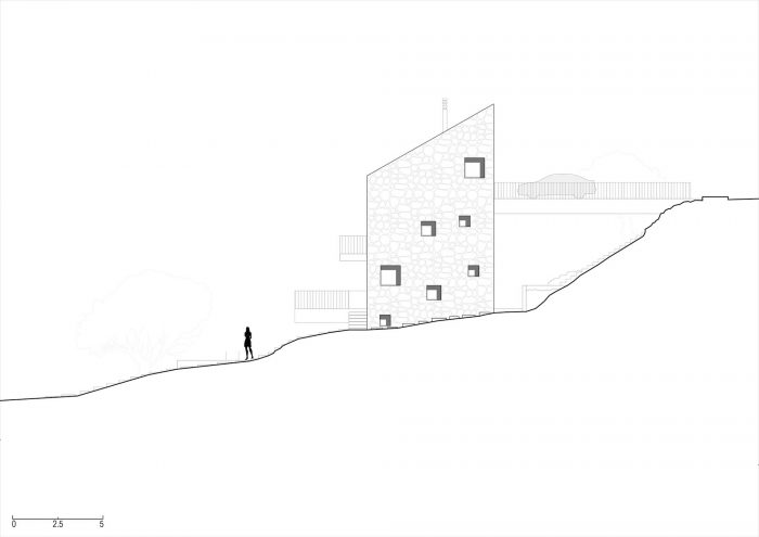 房屋的建造采用了正宗的维斯石。石头与磨光的混凝土块和表面协同工作,构成了控制台的露台、阳台、通往房屋入口的桥、路径、凉亭和屋顶。这些表面被设计成从房子的石头结构中伸出来,就像它们被切断的桥梁一样。这座房子所选择的材料保留了当地传统的记忆,使古老的(石头)和现代的(混凝土)共生在一起。这座房子作为一个片段,尊重了与城镇历史中心的形式和建设性关系。