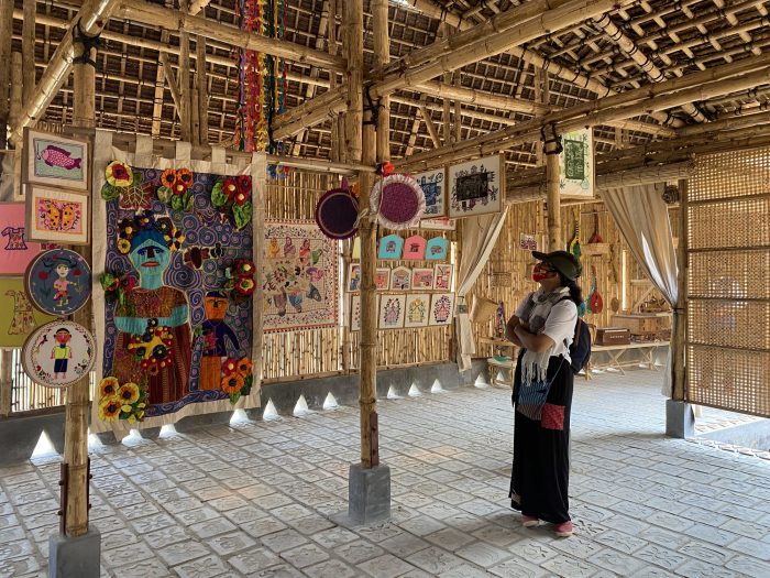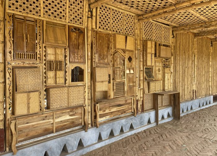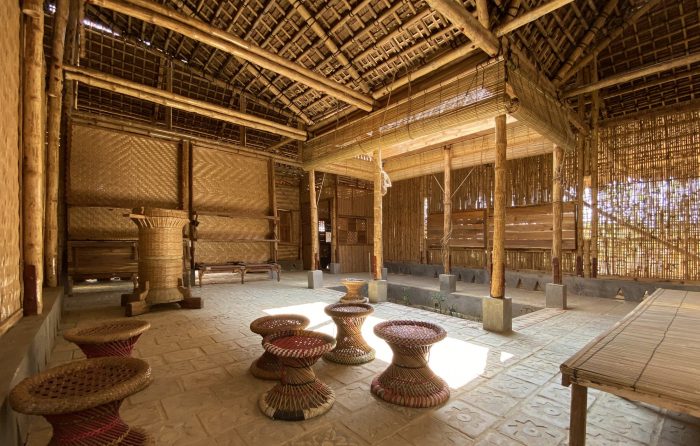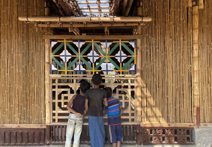 The elderly artisans who had the expertise for years taught the young generations the techniques that they used to have. While the young Rohingya souls explored new possibilities. The elements that composed the space were the outcome of various design sessions and hands-on workshops. For example, artisans were asked to reflect on their favorite memory/story by designing a small window. Own houses, fishing, elephants, birds, paddy fields, and all other memories were reflected and now stand together in the center reflecting a sense of memory and togetherness. Since this community has vast skills in natural materials, the materials were selected with caution to have familiar techniques during the construction. To achieve the target of inclusiveness and a joyful event, these natural materials created the scope to craft the building from scratch. Freedom of thinking and discussion was encouraged during the construction process to ensure mental well-being.