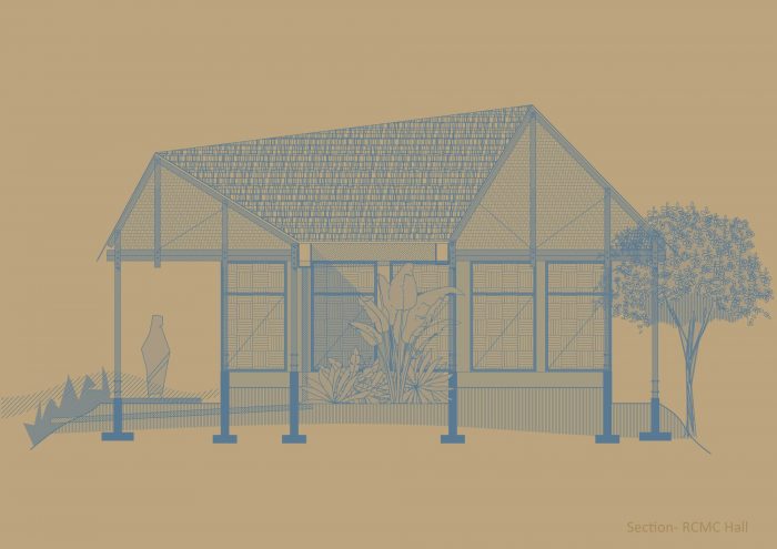 The four roofs are designed to catch and utilize rainwater if needed. They also create four courts inside that work as the source of light for the display. These courts also offer a serene ambiance within, that keeps the camp life outside. The strong bamboo screen that creates the hall is perforated, to have the breathability of the space. It also ensures security but allows visible connection from outside. The planning of the center ensured enough perforations in-between and within the halls, for rainwater to be absorbed by the hill soil. That will help the groundwater to be recharged continuously. The making of RCMC has been an event collaborating materials, efforts, and memories. Just to have a beautiful place to remember past and present. When there is a place like this, even in this temporary settlement, to practice the good, to learn from each other, the right and wrong, it is a blessing for all of us, to get to be engaged here.