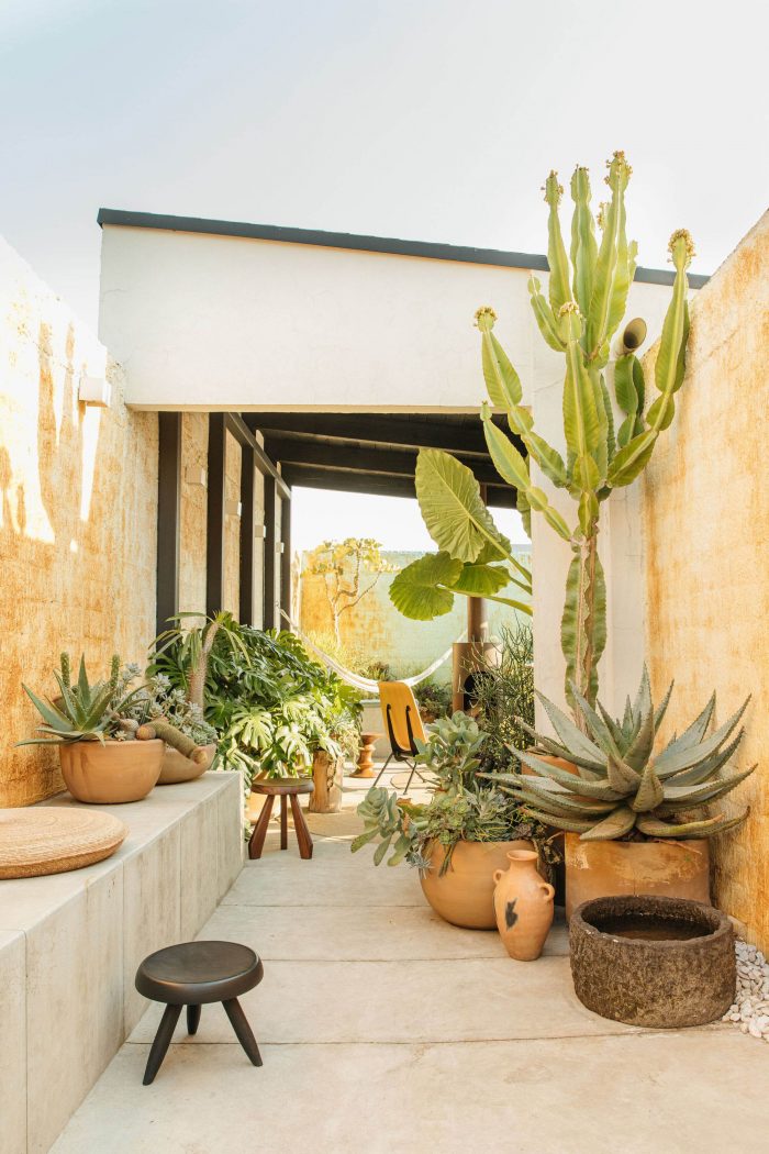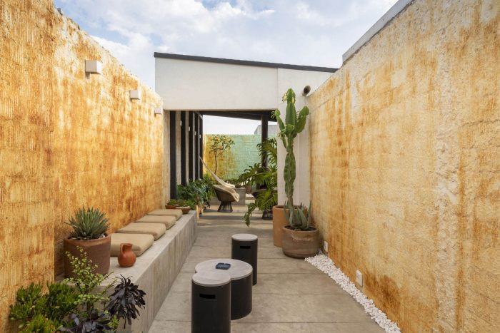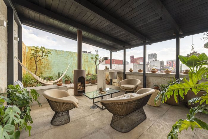 Under this element, a timeless and versatile space was created with different uses (contemplative garden, work space and meeting space) enhanced by the integration of elements designed by the office, such as cast concrete furniture and a suspended fireplace in corroded steel; complemented by the appropriation of the site through artistic and decorative elements selected together with the client. At the back of the room, there is a wall whose degraded pigmentation gives a sense of freshness to the palette of earthy tones. On one side, the pillars that support the structure generate visual frames for an emblematic panorama of the Mexico City skyline.