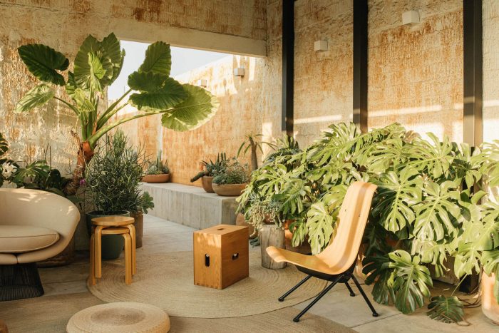 在这个元素下,一个永恒的和多功能的空间已经被创造出来,有不同的用途(沉思的花园,工作空间和会议空间),通过整合办公室设计的元素,如浇铸的混凝土家具和悬挂的腐蚀钢壁炉来加强;通过与客户一起选择的艺术和装饰元素来补充场地的使用。在房间的后面,有一面墙,其退化的颜料给泥土色调的调色板带来一种新鲜感。在一侧,支撑结构的柱子为墨西哥城天际线的标志性全景提供了视觉框架。