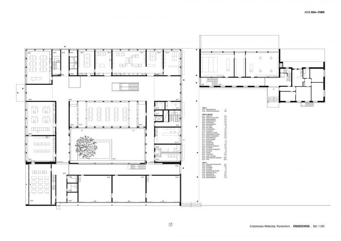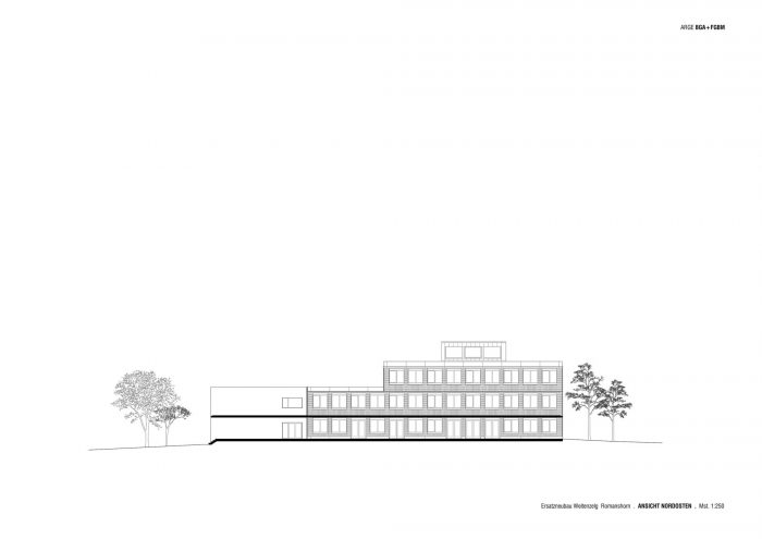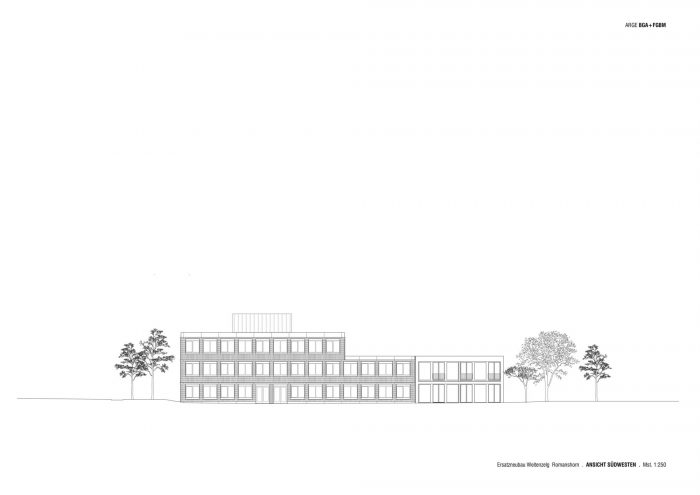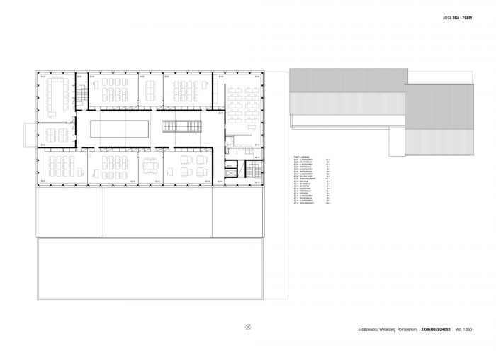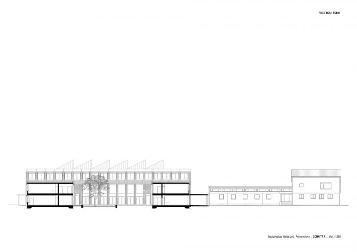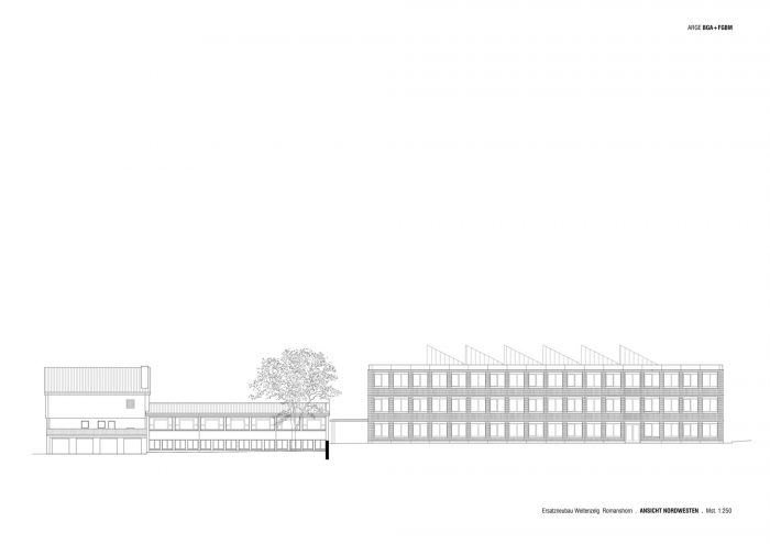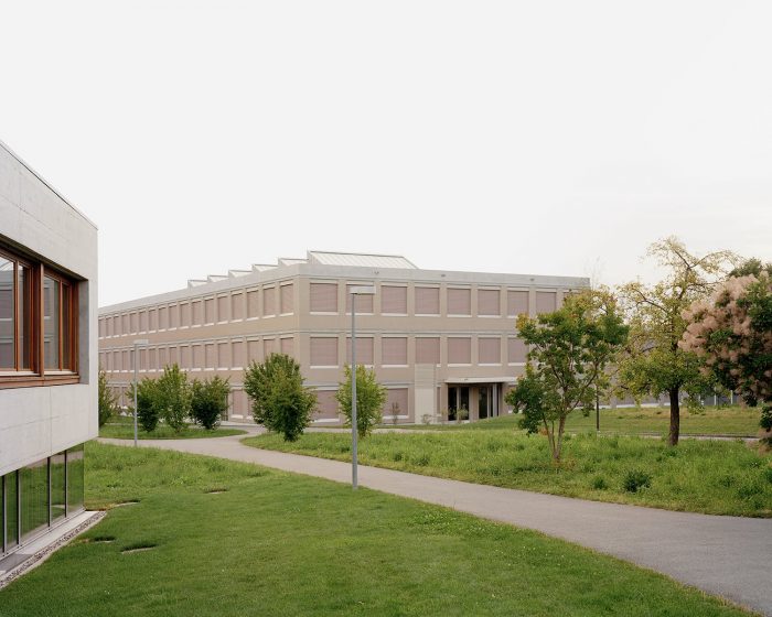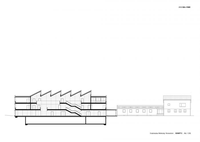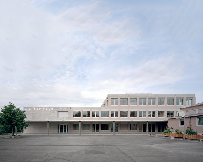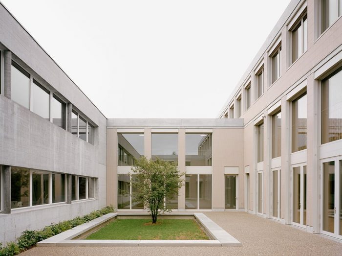In Romanshorn, a small town located at the Lake Constance in Switzerland, a centrally located educational, sports and leisure campus is developing. At its entrance one finds the building complex of the secondary school. The new construction replaces two outdated buildings and links future and past developments. Together with an existing building from the year 2000 it forms a spatial and functional unit, while a new gallery along the entrance façade creates a connection with the existing building positioned on the opposite side. Its compact design and orientation leave room for future developments at the campus entrance, occupying a minimal footprint of the site being made available by the client.