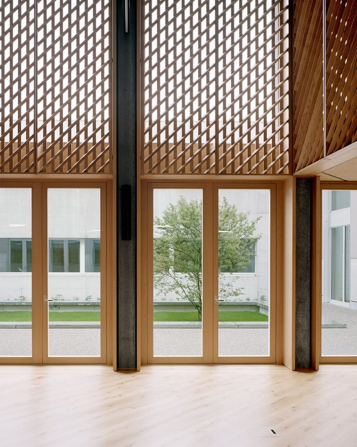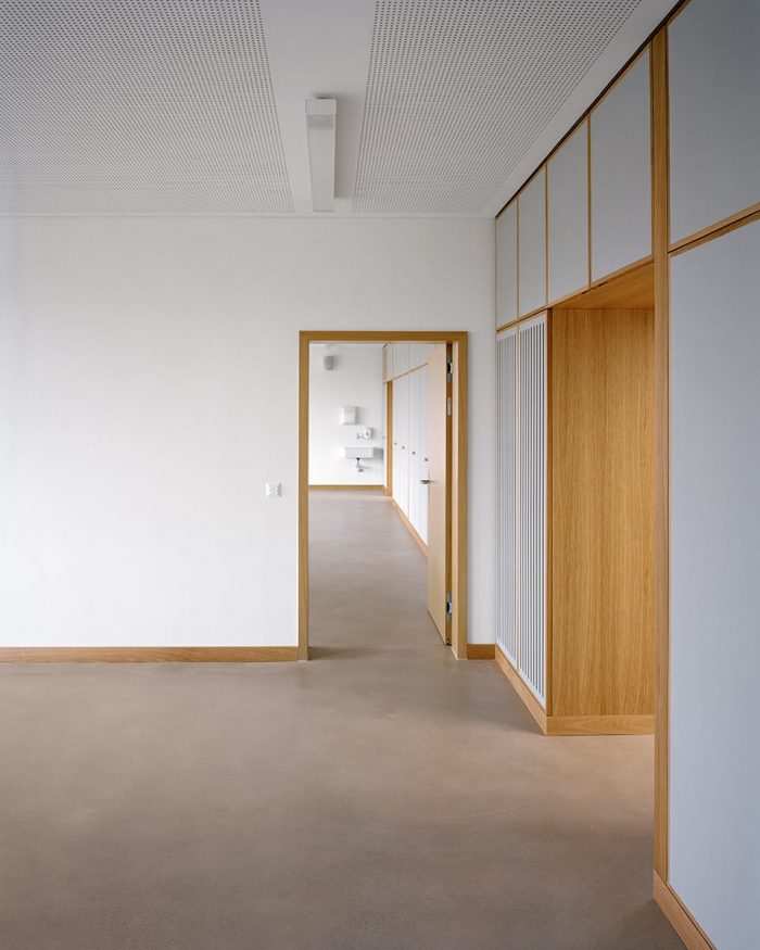 The building is vertically accessed by a centrally located open staircase and two diametrically opposed emergency staircases in the corners of the building. The latter allow the corridors to be designed as recreation and movement areas with free use, as they do not have to be designed as escape routes. Light shafts over two storeys also provide visual relationships here and bring daylight from the dominant shed roof into the building.