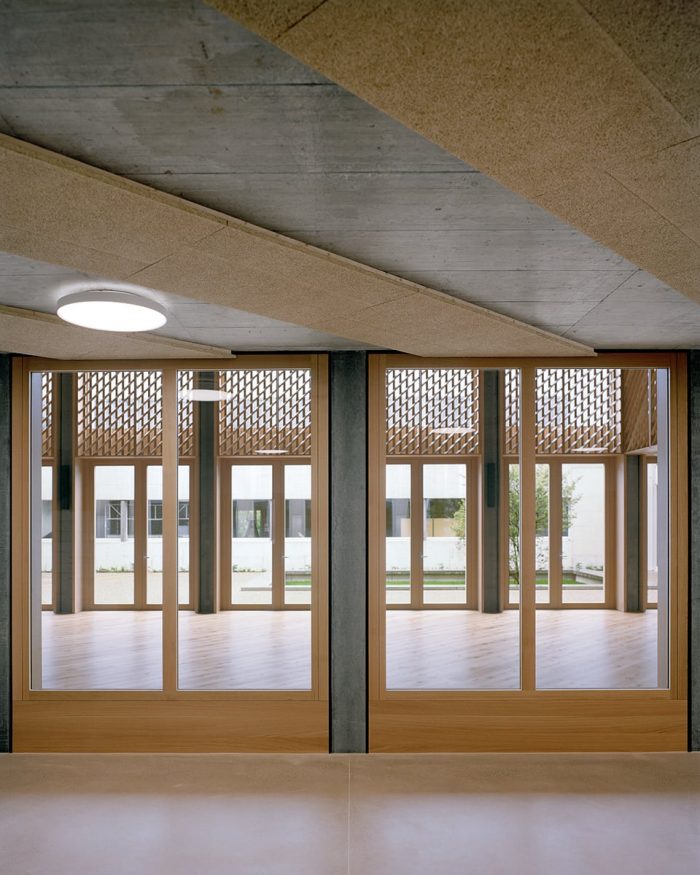 The internal materialisation emphasises the three room zones of the building: core zone, movement zone and classroom or group room. The central Salão is the "living room" of the building. Its preferred location, the flexible and open use and the design with pleasant wooden surfaces make it the backbone of the school's character. The most heavily stressed movement zone is mineralised. The wall surfaces are exposed concrete, the floor is pigmented hard concrete. The classrooms are based on the term "Schulstube" and are classically materialised with white plaster surfaces and pinna-able cabinet fronts.