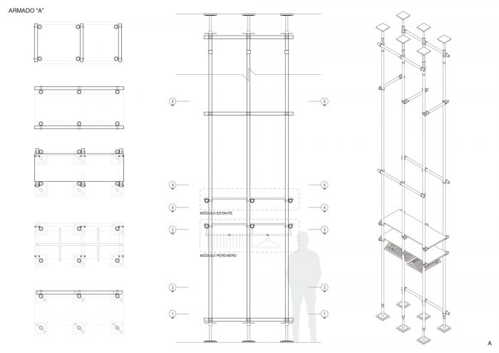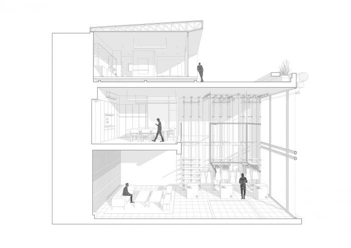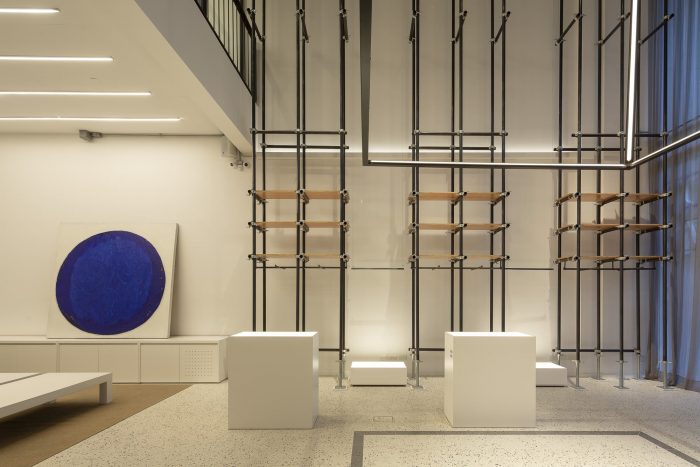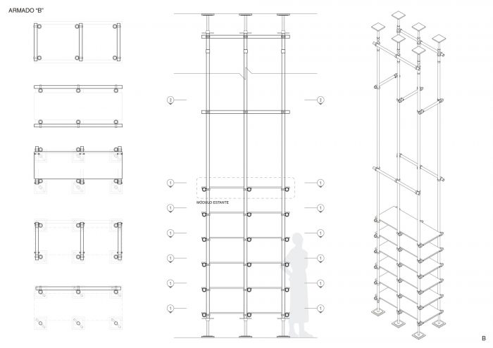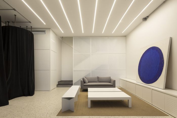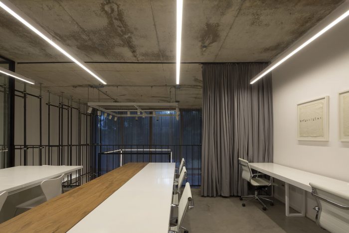 In order to accomplish the flexible and contemporary space pursued furniture design was also vital. The equipment should serve as exhibition elements, enhanced by the integrated lights, as well as storage devices. As a result, scaffold-like structures were assembled to provide the possibility to adopt different configurations (exhibition, storage, workstation) depending on the user’s necessity and the different programs that the space can accommodate.