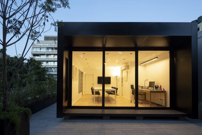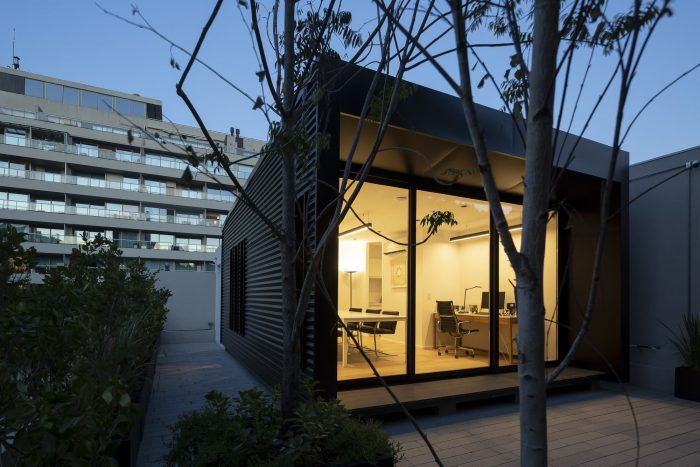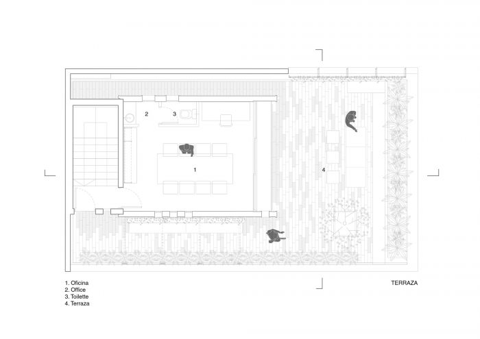 On the upper floor, there is a complementary office space that can work autonomously from the rest of the building. The main office is placed on the terrace to gain privacy. Together with a green outdoor space they create a meeting and leisure space that ends up complementing the whole building scheme.