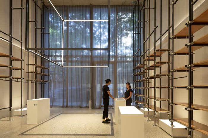 The aesthetic of industrial and raw materials was chosen to merge with the homogeneity and purity of white. Iron, aluminum, and timber are in plain sight producing a contrast with the whiteness of the floor and walls. From the outside, the glass-covered façade features this quality inviting anyone who passes by to stop and contemplate it.