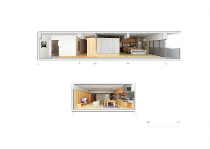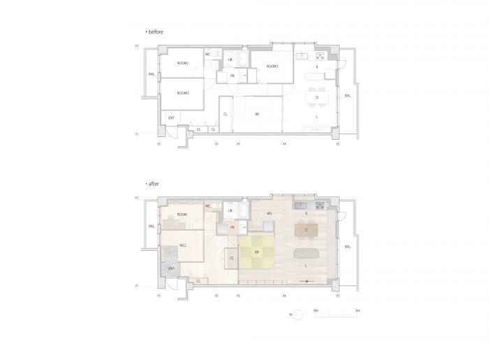 这个项目是为日本横滨的两对夫妇进行的公寓装修。这个房子的东侧有一个有特色的窗台,但在改造前的规划中,窗台中间有一道隔断墙,难以保证空间和亮度。此外,中间走廊式的包房布局没有保证风和光的漏洞,给人的感觉是房间整体很暗。