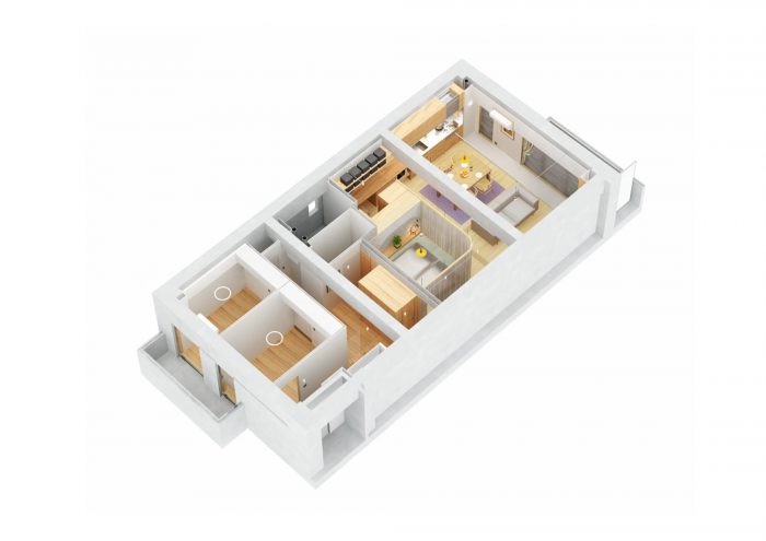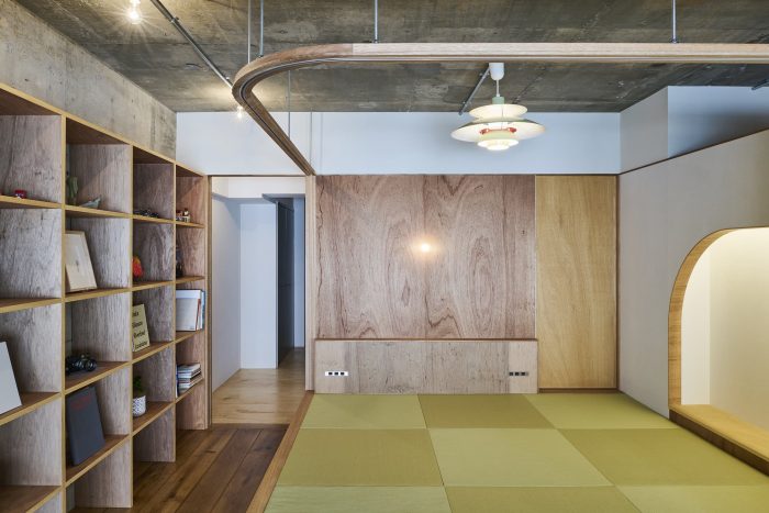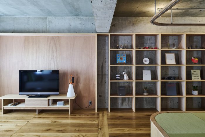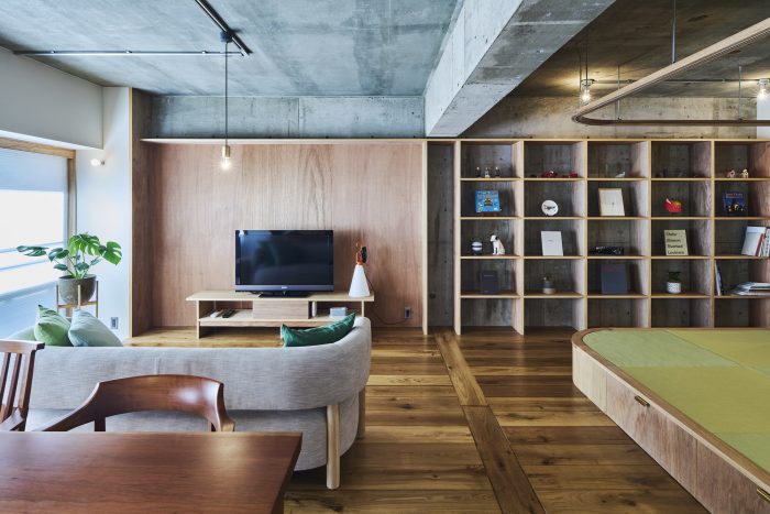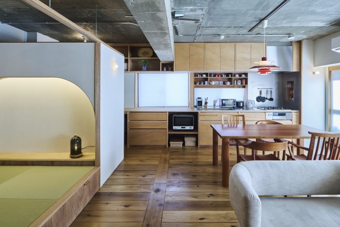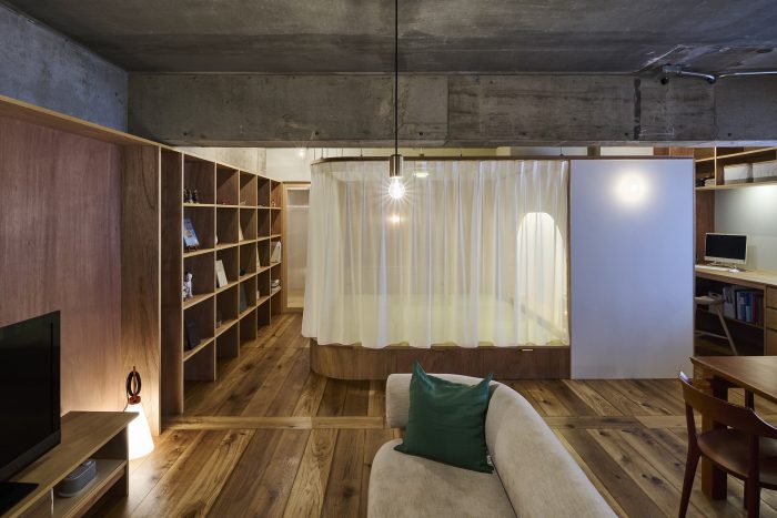This project is an apartment renovation for two couples in Yokohama Japan. This house has a characteristic bay window on the east side, but in the plan before the renovation, there was a partition wall in the center of the window, making it difficult to secure space and brightness. In addition, the layout of the private rooms in the middle corridor style did not ensure a loophole for wind and light, giving the impression that the room was dark overall.