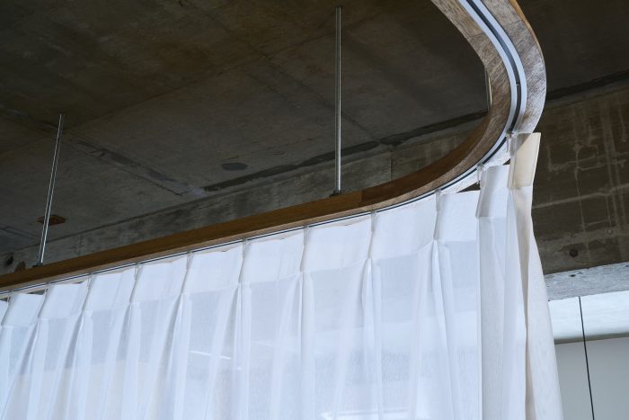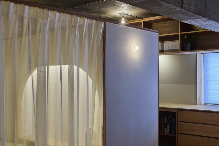 Taking advantage of the fact that it was possible to reduce the number of private rooms in the renovation for the couple, we proceeded with the plan to create a bright and airy indoor environment. First, by placing an island-shaped Japanese-style room and bedroom in the center of the house and creating a side corridor, a straight path was created from the entrance to the living room. The island can be turned into a private room by opening and closing the curtains, creating an island that changes its expression according to the time as a spacious space connected to the LDK in the morning and afternoon, and a sleeping space surrounded by curtains at night.