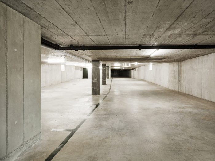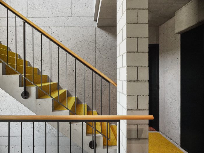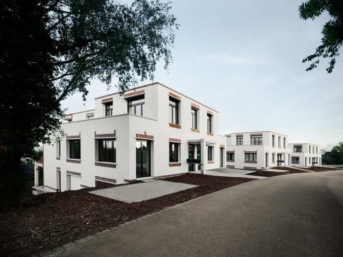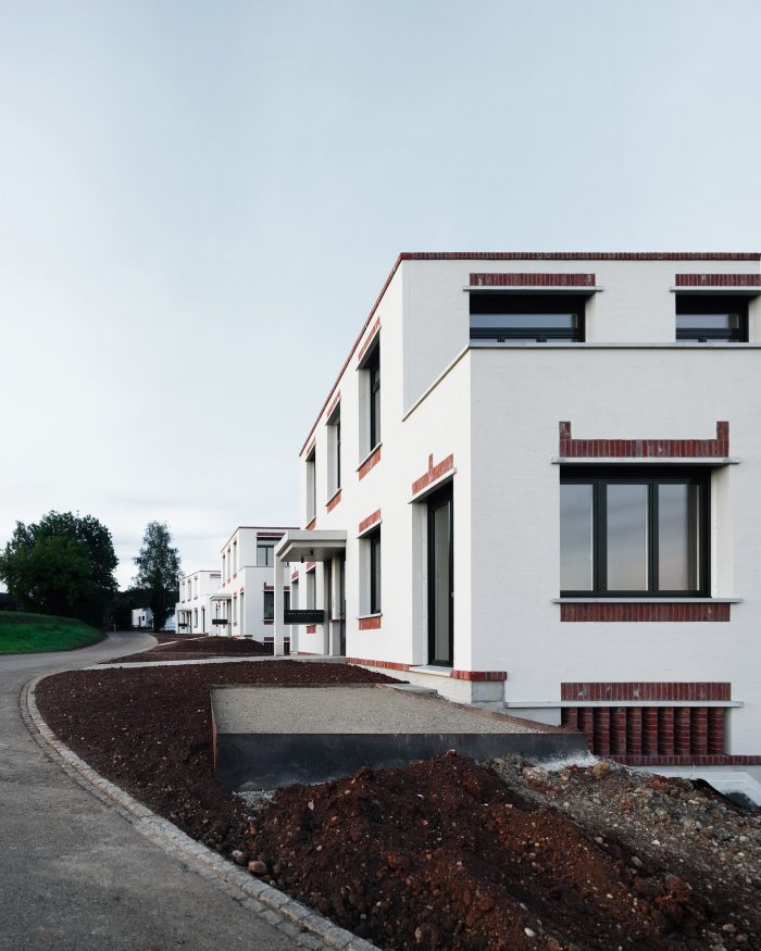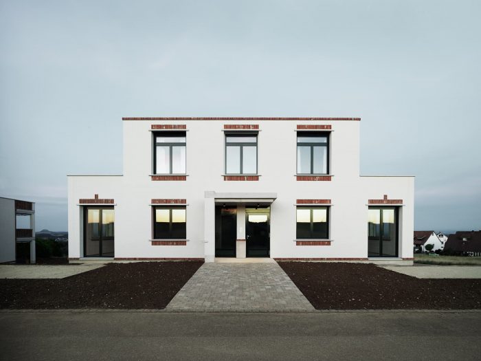 The architectural expression is characterized by a specific use of building materials – structurally consistent and playful at the same time. The brickwork is the most characteristic component. The outer layer of the double-shell masonry made of whitewashed sand-lime brick rests on a concrete base. The wall openings in the facing brickwork are spanned by precast lintels. The classic facade lintel, consisting of a reinforced concrete core and a brick shell in front of it, is divided up according to its function. Spanning and cladding are separated and both components are made visible.