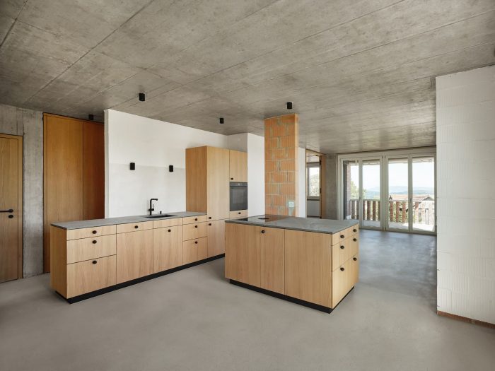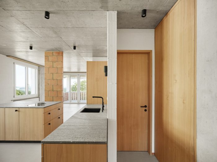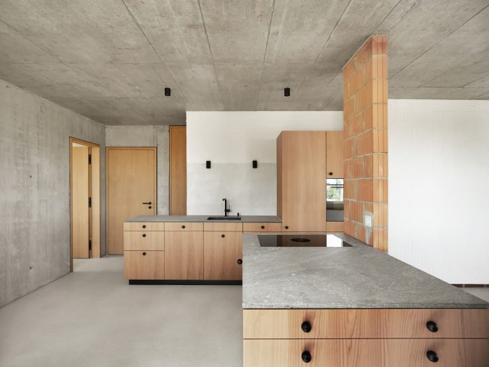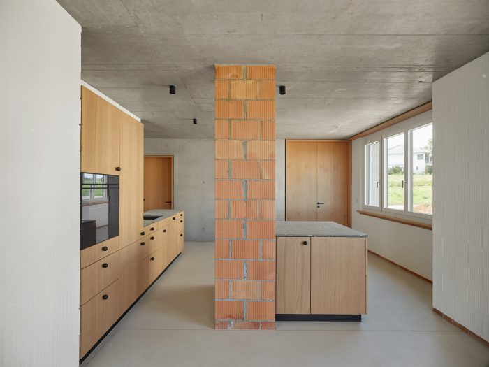 The materiality of masonry is not only to be seen on the outside but also to be equally tangible on the interior. The brick walls are painted white, and where the supporting structure is reduced to columns, the bricks are left completely raw. In an equally direct approach to the material characteristics of cement, the concrete ceilings, walls, and anhydrite floor are left visible. Furthermore, the cherry wood carpentry with its pure naturalness creates a warm and cozy atmosphere.