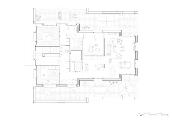 砖石的物质性不仅体现在外部,也同样体现在内部。砖墙被涂成白色,而在支撑结构被简化为柱子的地方,砖块被完全保留。在一个同样直接针对水泥材料特性的方法中,混凝土天花板、墙壁和无水石地板被保留下来。此外,樱桃木的木质结构以其纯粹的自然性创造了一个温暖和舒适的氛围。