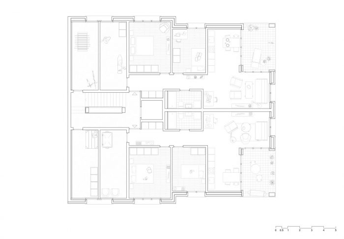 在Stetten的Rootacker,提出了一个开发结构,与现有的单户住宅区相呼应。倾斜的场地被三座公寓楼占据,它们顺着地形的自然走向。虽然达到了预期的密度,但这种梯度在建筑物之间留出了足够的空间,使山谷的景色不受阻碍。三栋房子中的每一栋都包括五个明亮的单位,具有不同的尺寸和平面图。它们都有一个共同的特点,那就是朝向风景和一个流动的房间顺序。