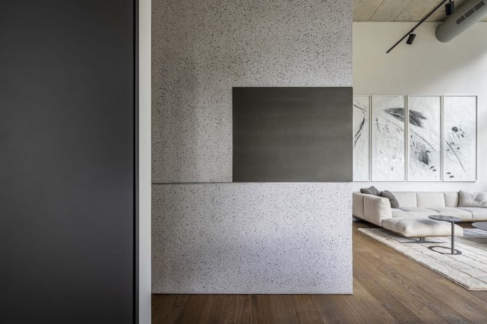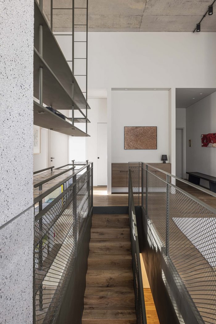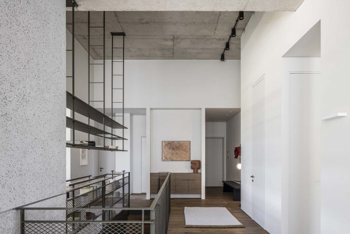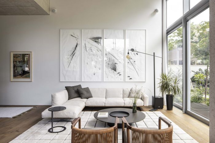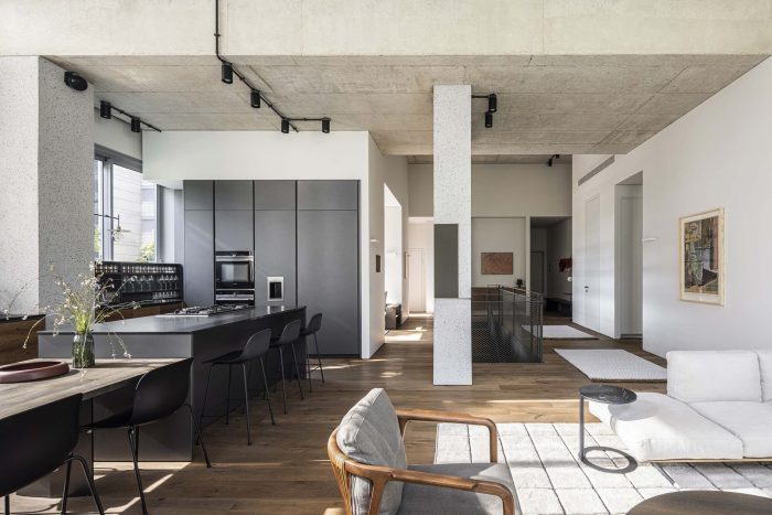 The fantastic concrete ceiling was a given starting point, which we straightaway requested to keep intact and not cover with plastering. The unique height of the ceiling and windows were for us a fantastic celebration of space. Managing the acoustics and intimate vibrance of a home is the greatest challenge in such a situation, therefore we chose to work with a lot of wood and fabric. Some of the design elements we inspired by the roots of trees.