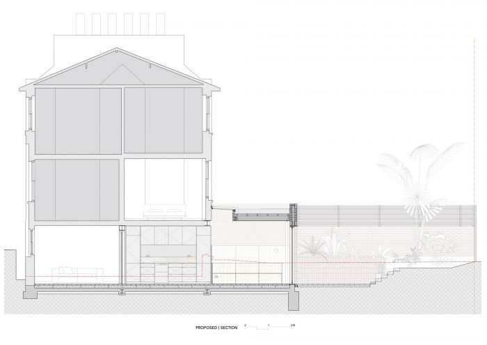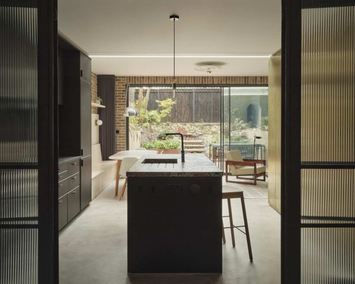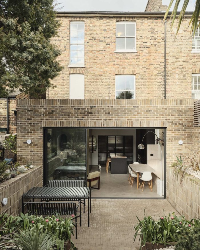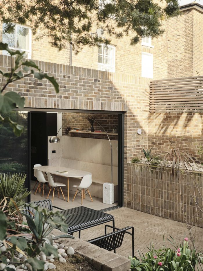 Atelier Baulier removed an existing shed and the entire rear facade at the lower ground floor level to combine the new and old areas. In order to give the owners extra breathing space, the existing floor level was lowered by 30cm and the garden was excavated to add a sunken patio continuing seamlessly from the living room.