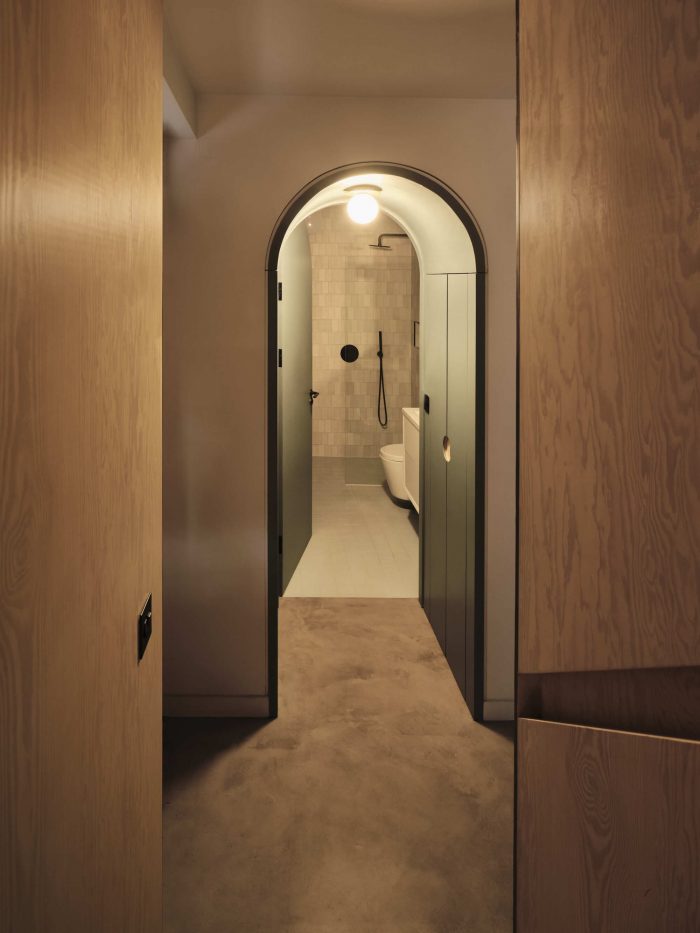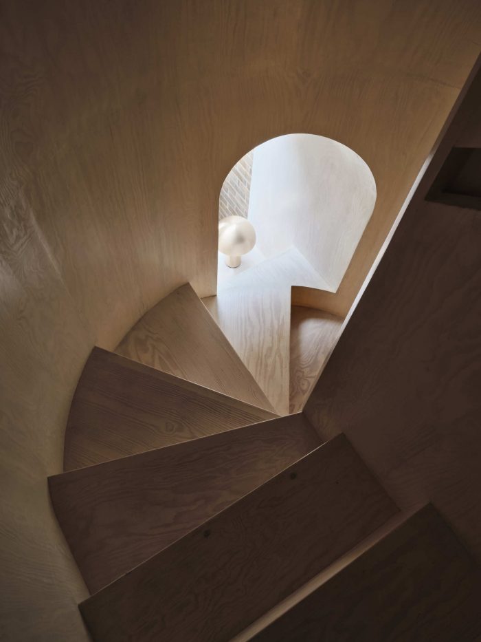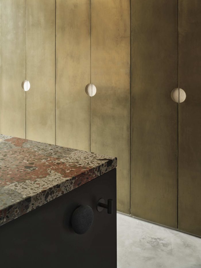 在室内,材料的选择是为了它们的耐用性和随着时间的推移获得铜锈的能力。重点是天然黄铜包覆的体量,它巧妙地反射和分配光线到地板深处,其纹理随着时间的推移变得更加深刻和丰富。浅灰色的粘土地板统一了所有的区域,并与天井的粘土铺面相匹配。白色涂油胶合板的点缀贯穿整个项目,从弯曲的楼梯到定制的高背餐椅。黑色的宜家厨房由回收的塑料瓶制成,采用格兰比岩台面,用建筑碎石捆绑在一起,形成一种类似水磨石的材料。