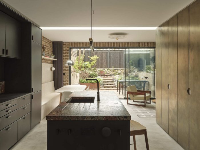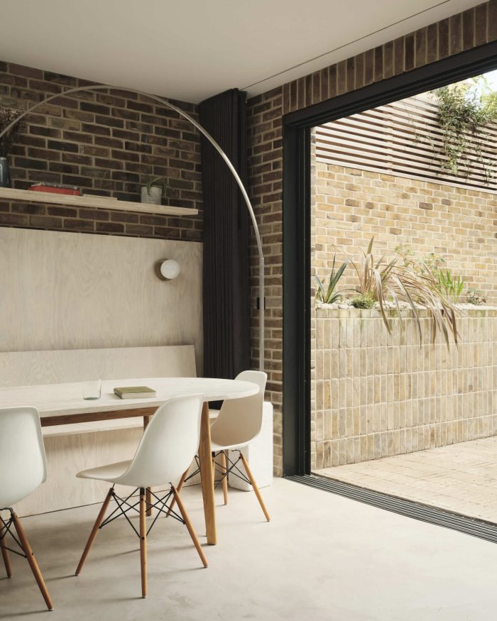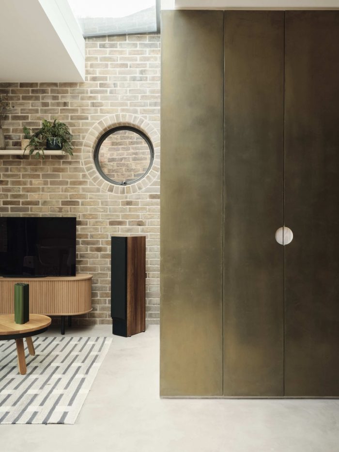 Inside, the materials were selected for their durability and ability to acquire a patina over time. The focus is on the natural brass-clad volume, which subtly reflects and distributes light deeper into the floor plate, its texture getting deeper and richer over time. A pale grey clay skim floor unifies all areas and is tonally matched by the clay pavers of the patio. Accents of white oiled plywood weave through the project, from the curved staircase to the bespoke high-back dining bench. The black Ikea kitchen, made from recycled plastic bottles, features Granby Rock worktops which use building rubble bound together to create a terrazzo-like material.