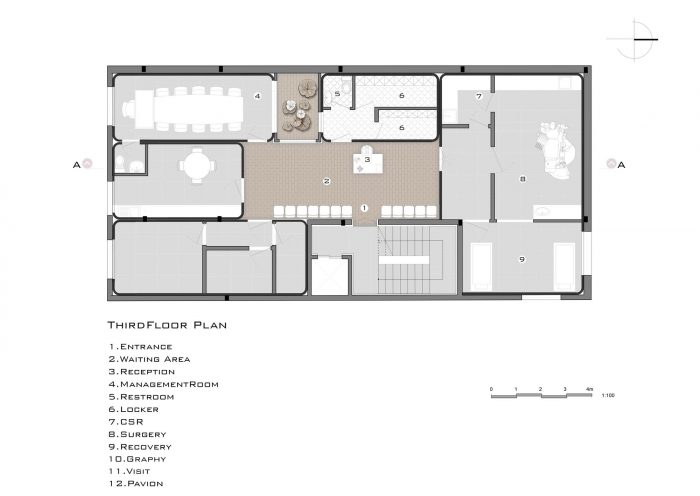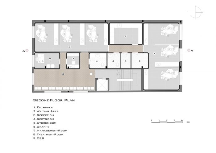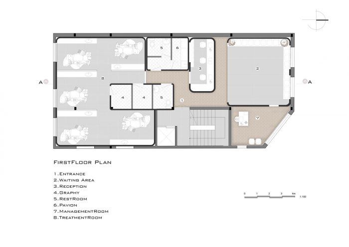 plan design - One of the most important features that should be considered in the design of treatment spaces is the readability of the collection and the definition of proper access to its interior spaces. Neglecting this issue may confuse the patient and turn into a stressful situation for him, or on the other hand, by instilling a sense of respect for staff and clients, increase their efficiency and satisfaction. In designing the plan of this project, the reception desk is placed right in front of the entrance door so that the clients could easily see it at the entrance and find their way. The waiting area is also located near this part and in interaction with it.