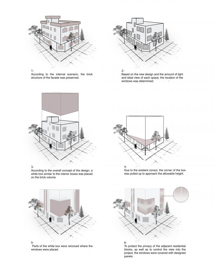 Facade design - As mentioned, our strategy in choosing the method of reconstruction was "linking the building with the city and its context ", in a way that is perfectly in line with the texture of the neighborhood, but at the same time looks significant and eye-catching. We also intended that the lines and ideas that shape the facade also arise from the internal scenario of the building. Accordingly, we maintained the brick structure of the facade with the same color and smell of its past, and this time we placed the white attachment box “on” the brick background.