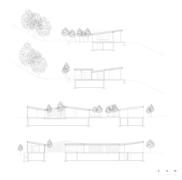 The Roxbury House marries art and landscape in intimate and broad moments. The house is positioned uphill and on the edge of the 12-acre property to strategically take advantage of prevailing winds for natural ventilation and to minimize site disturbance, allowing the existing open meadow and forest to support local wildlife and native vegetation. The undulating roofs and their deep overhangs simultaneously draw in sunlight at different times of the day and frame landscape views while also reducing direct glare and solar heat gain. Rainwater management— through a series of rain gardens and retention ponds— mitigate erosion along the steep terrain.