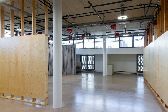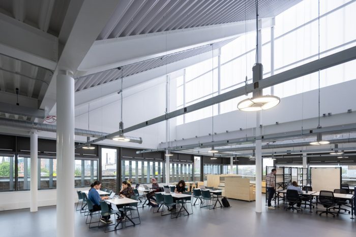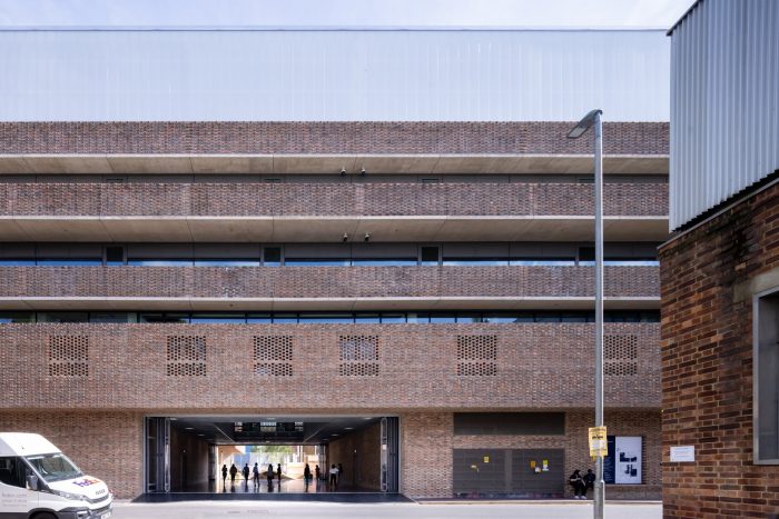 A portion of the previously closed-off Radstock Street is incorporated into the ground floor; upper studio floors span across this space to create a double-height “Hangar” – a flexible zone for the production and display of large-scale work that is also spacious enough to host RCA assemblies and events. This space can also be opened to the public, creating another thoroughfare from Howie Street to the main reception area of campus.