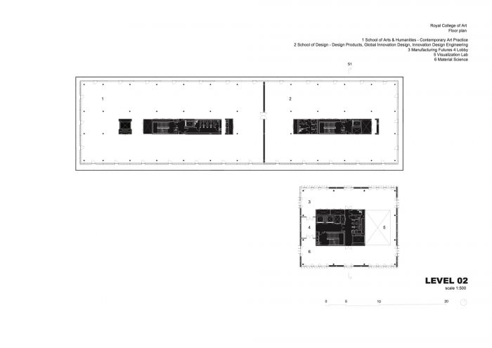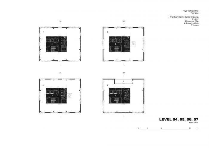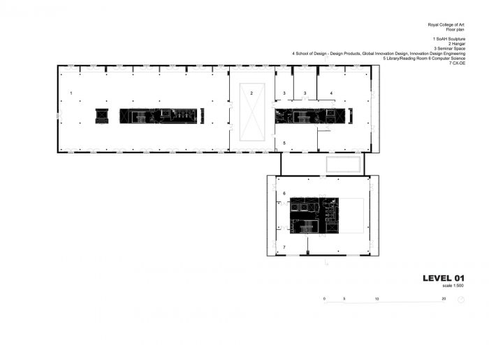研究楼位于底层工作室之上,由七个560平方米的楼板组成。与工作室楼层的原则相同,每个空间都是一个灵活的研究单位,配备了临时的实验室空间。创新RCA,新兴的研究生商业孵化器,位于5和6层。7层有一个活动空间和露台,可以看到北部和RCA校园的其他地方。