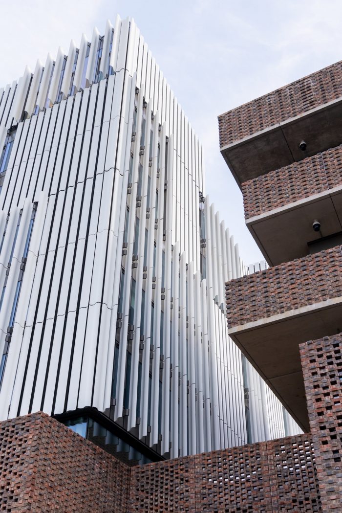 The Research Building departs from the masonry language with a vertical composition of sinuous white fins, calibrated across the façade to moderate solar gain and glare, and facilitate natural ventilation to the workspaces within.