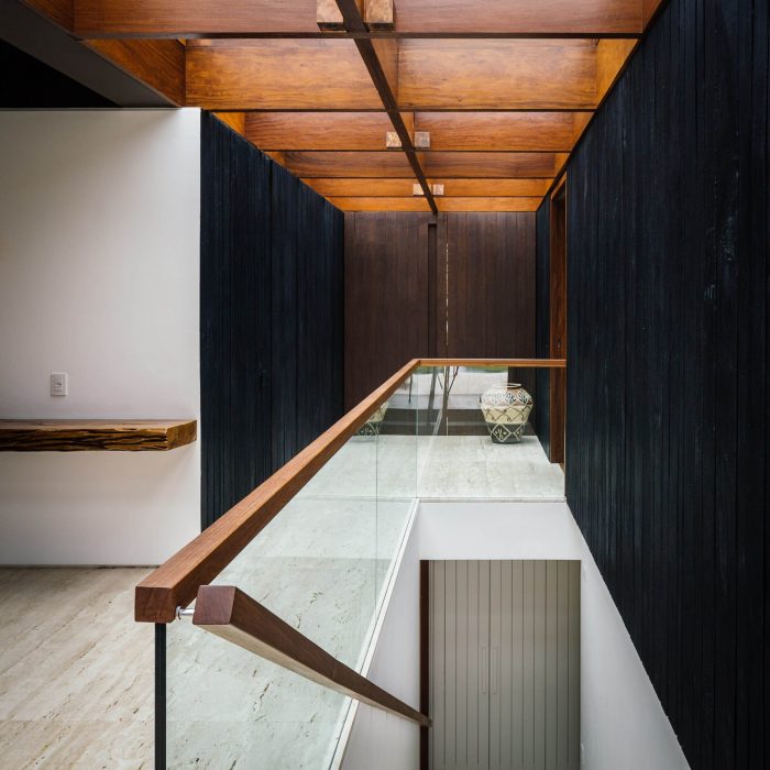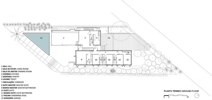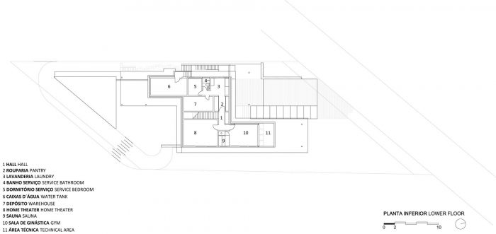 The conceptual aim of this project was to develop a house with two floors that visually appeared buried. For that, we raised the main level of he house 1.5 m, creating a lower, half buried level, yet with natural lighting and ventilation. On this floor are the service and leisure areas, such as home theater, gym and sauna.