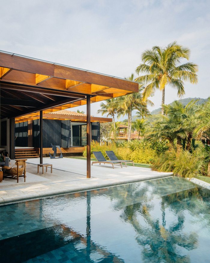 Despite the mandatory use of a sloping roof and ceramic tiles, the house seems to have a flat roof, as from the outside one can only see the wooden eaves and glass. The minimum slope we create is only visible from inside. The triangular pool has its shape determined by the boundaries of the building.