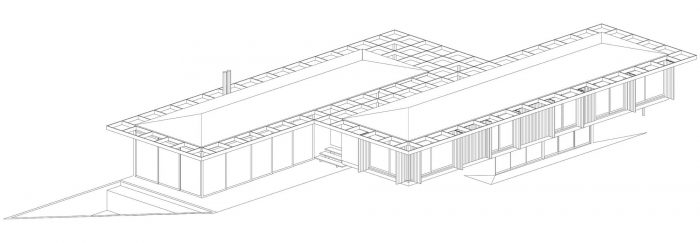 In structural terms, we use reinforced concrete for foundations and for the half-buried floor, columns and steel beams to the main floor and wooden structure for the roof.
