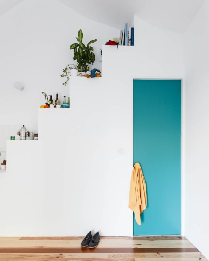 Unorthodox everyday spaces are built according to a clearly defined syntax and grammar. The four living rooms are different from each other while sharing the same language, the same set of figures. A defined number of elements - morphemes - within which the project operates: the stepped wall, the curve, two doors (one pink and one green), the striped surface of the floor. The living area becomes a gallery space.