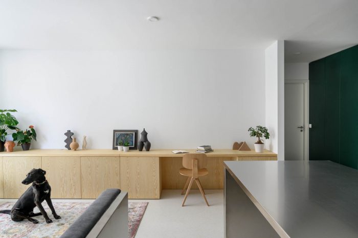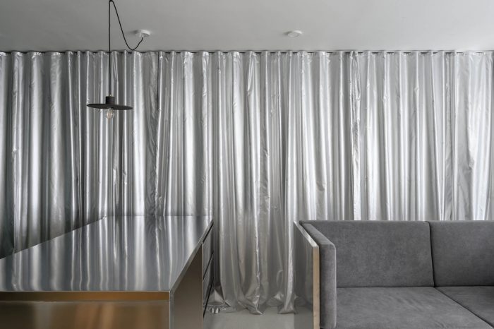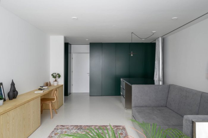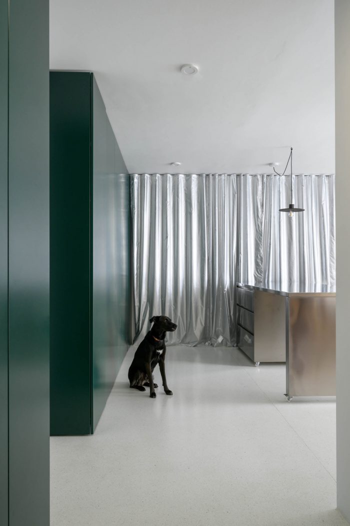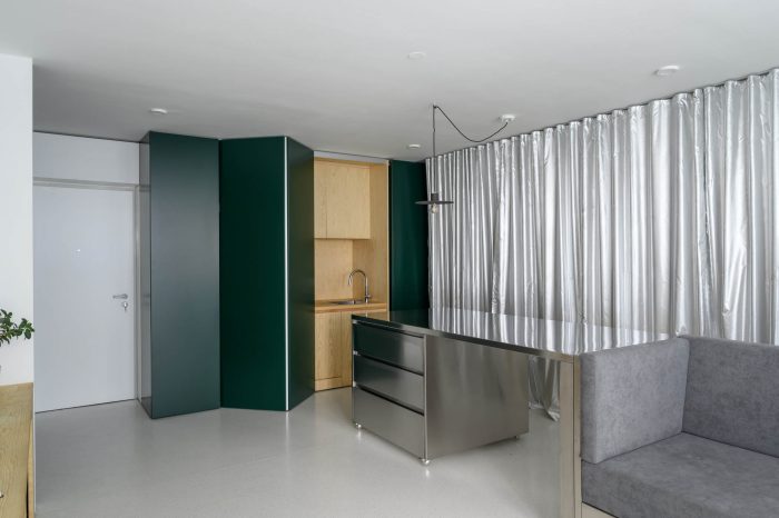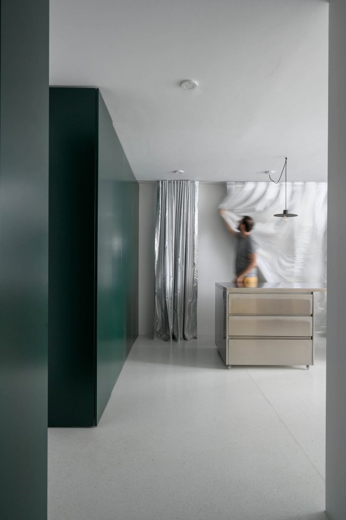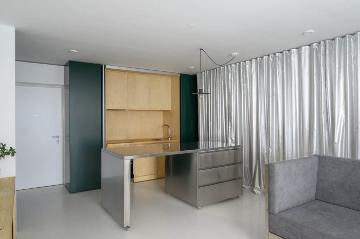 The floor in the apartment is made of bright terrazzo. As space is meant for dynamic use, this type of flooring is durable and brings a feeling of freshness to the apartment. All mobile furnishings are made of stainless steel to ensure durability. Also, their subtle luster acts as an additional light source further inside the apartment. The service area, which includes a kitchen, washing machine, and a utility, is tucked inside a series of spacious closets at the main entrance. The dark green color of this set symbolically marks the edge of the apartment and acts as a counterbalance to the light and metallic materials that dominate the interior. Hidden behind hinged panels is a wooden kitchenette. The bedroom is also clad in warm tones of wood panels.