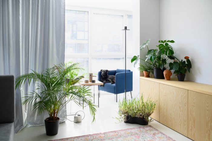 The atmosphere in the apartment is co-created by pots of tropical and Mediterranean plants, a series of original graphics, and unique ceramic pieces.