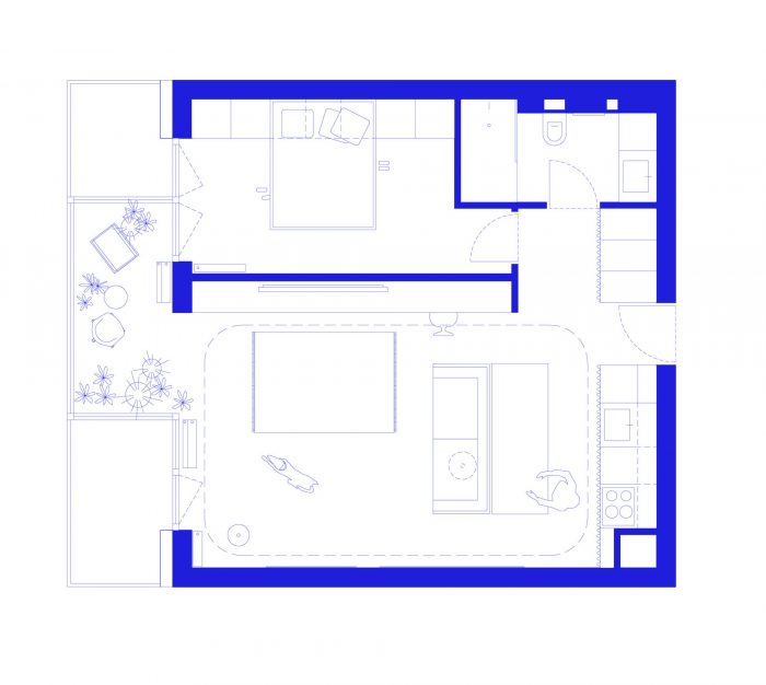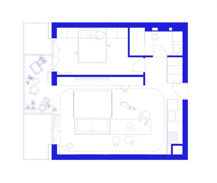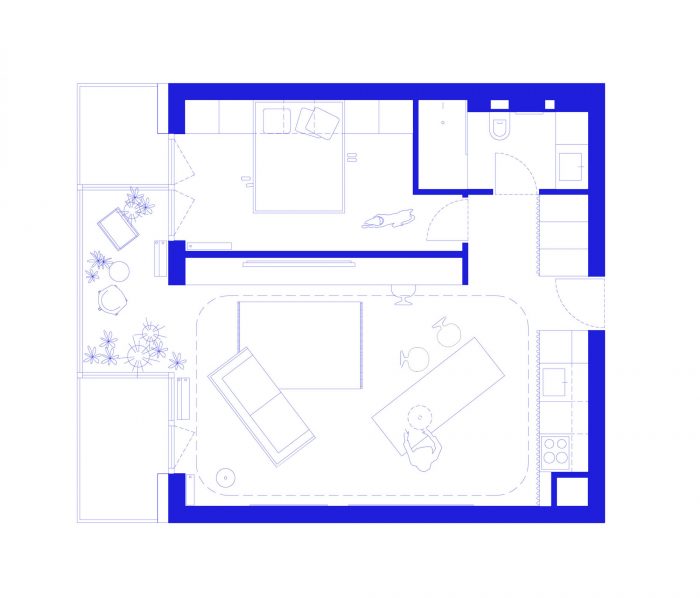 The original, standard arrangement of a one-bedroom apartment did not quite correspond to the dynamic lifestyle of the clients. Because their pet is an important part of the family, the aim was to design a space without corners and closed-off spaces. By demolishing all existing partition walls the living space opened up to a circular movement, also becoming a polygon for the dog's daily activities. The living room is connected to the bedroom through a winter garden. The only enclosed space in the apartment remains the bathroom.