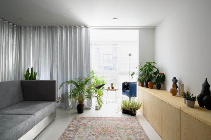 The buyers of the apartment are a young couple. Until recently, they lived on the rural outskirts of the city. Missing the bustle of the city in their green environment they decided to buy and renovate an apartment on a location that yields the best of both worlds. This ambivalence between urbanity and nature was the conceptual starting point for the renovation of this 60 m2 apartment.