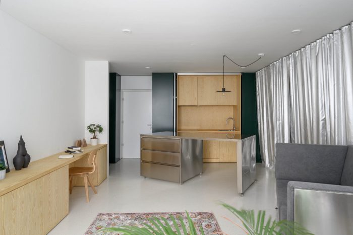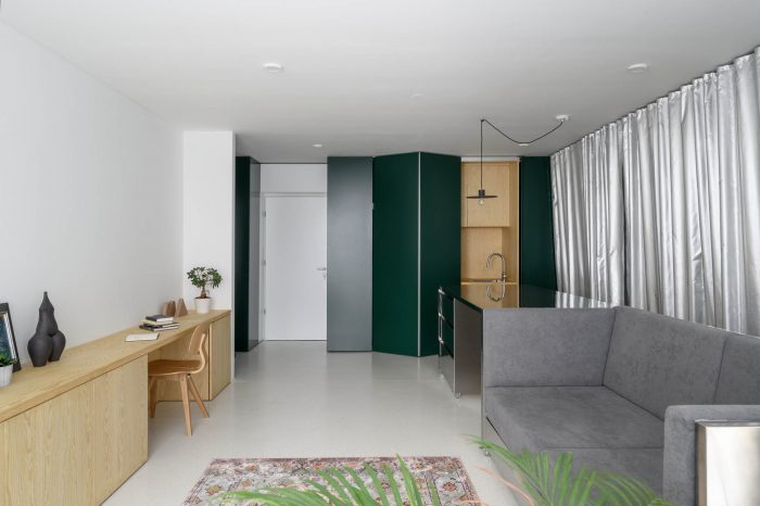 公寓的地板是由明亮的水磨石制成的。由于空间是要动态使用的,这种地板经久耐用,给公寓带来了新鲜感。所有的移动家具都由不锈钢制成,以确保耐用性。同时,它们微妙的光泽还可以作为公寓内部更多的光源。服务区包括厨房、洗衣机和公用设施,藏在主入口处一系列宽敞的壁橱内。这套公寓的深绿色象征性地标志着公寓的边缘,并与室内占主导地位的浅色和金属材料形成平衡。隐藏在铰链板后面的是一个木质小厨房。卧室也是用暖色调的木板来装饰。