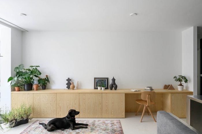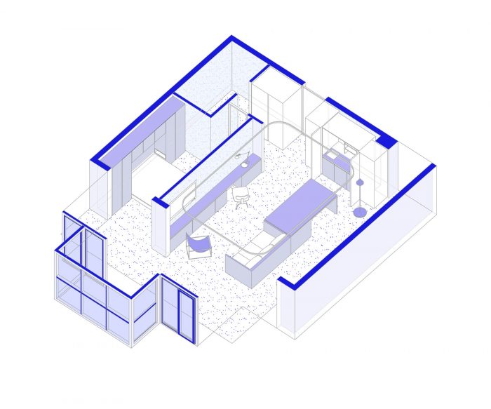 客户大多在家办公。同时,他们的社交生活也很活跃,组织素食午餐聚会、电影之夜和与朋友共进晚餐。他们练习瑜伽和训练他们的狗。因此,固定和僵化的家具与预定的位置和功能将阻碍这种生活方式。我们在轮子上的移动家具中找到了解决方案,使生活安排更加流畅。两个大的元素:一个宽大的柜台和一个大沙发都可以在房间里自由移动,创造出多样化的社交场景。
