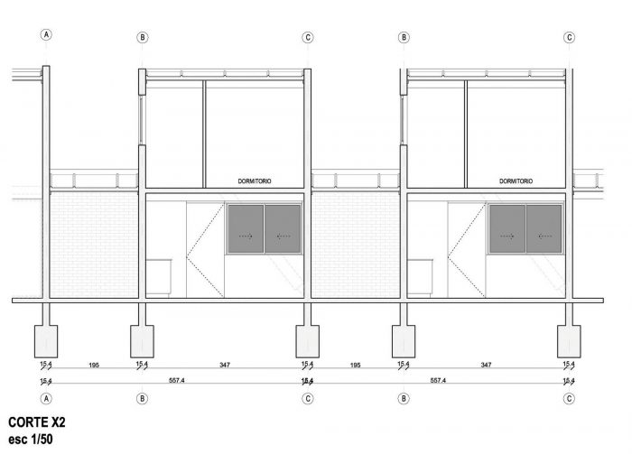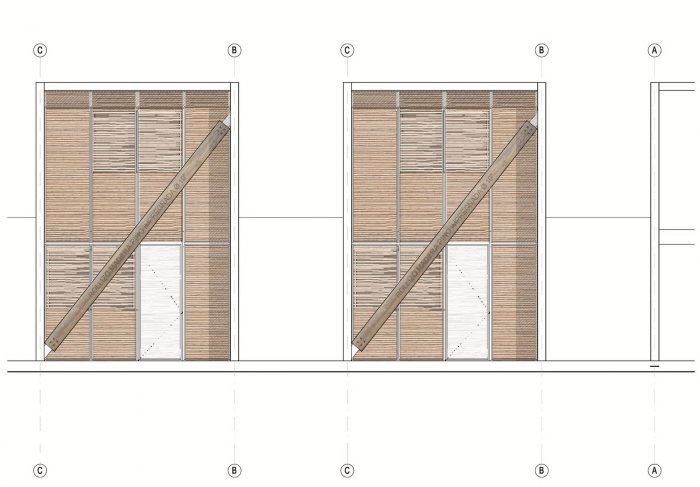 作为一种建筑技术,砖和钢筋混凝土框架的工匠传统被使用,表达了项目的外观和结构性质之间的对应关系。由浸渍松木制成的对角线是主立面和后立面的特点,是一个结构元素,在地震时支撑侧墙。这些外墙的墙面和窗户由双层 "cañada de coligüe "覆盖。杆件之间的最小距离允许内部过滤的光线通过,同时也显示了项目的灵感传统。