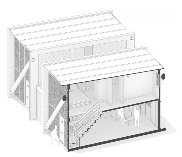 The 61 square meter home is divided into two floors. Inside, the program is simple: the living area and kitchen are on the ground floor. The latter is larger than in similar social housing, as it considers the importance of "fire" (kitchen) in Mapuche tradition. Upstairs there are two bedrooms and one bathroom. The interior was given to the residents as a bare inhabitable structure, allowing each family to build finishes according to their means and taste. Notwithstanding the conventional program and the neutrality of the rooms (product of ministerial regulations), the dim and fragmented light inside evokes an atmosphere that reminds us of the darkness of the rukas, separating them from what happens outside in the city. This strategy also defined crisply the interior and exterior, opposed worlds in the Mapuche tradition, different from the modern tradition where interior and landscape are continuously integrated.