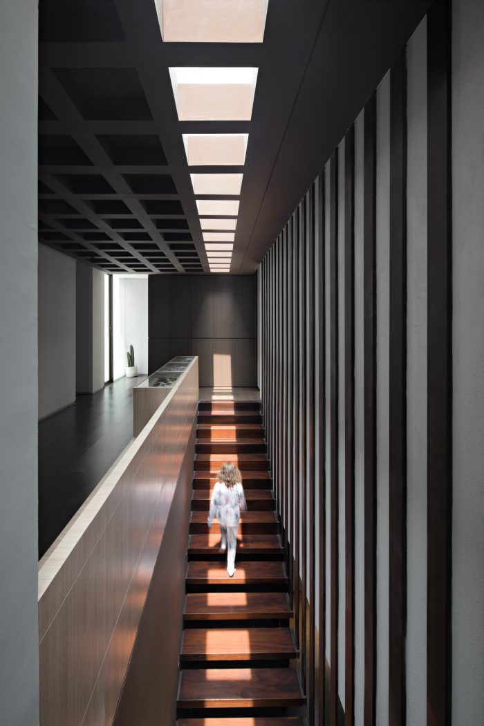 从街上看,这栋房子在质量组合、材料和颜色方面显得很温和。然而,在表面之下是一系列的建筑空间,其设计在功能上是独特的,但在体验上是丰富的,特别是在与自然元素的结合上。这座房子被分成两个不同的体量:一个是带有现代柱廊立面的低调的白色水平长方形上部体量,而下部体量则更多地被棕色华夫饼结构天棚的暗示所支配。棕色华夫饼作为主要的建筑特征贯穿始终,将空间结合起来,加强了流动感。它通过沿途的自然色彩增加了温暖的感觉。空间通过华夫饼图案的整合而膨胀和扩大:它与室内天花板、天窗、主阳台地板和天棚结构同步。在室内战术性地放置华夫饼,也在视觉上放大了尺寸,并将自然光从上方的天窗中全部框住。最值得注意的是,在周围众多的树木中,阳光透过树叶照射进来。然而,整个房子僵硬的矩形形式通过绿色植物的加入、室内-室外的错觉和双高的天花板而变得柔和。