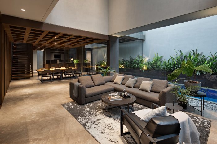 The centrally located courtyard mediates between the main house and the pavilion as an interstitial space between the two. The pavilion—taking formal qualities from the main house—reads as a separate volume. Yet, flexible options for opening and closing living areas with glass doors make for an immersive connection with the pool, courtyard, and open skies and address the need to extend spaces. The pavilion is executed to activate the space as a guest bedroom and bathroom with a prayer room to visit daily. The monumental energy of the two-story masses contrasts with the reflection and soft sound from the water. A sophisticated rawness is celebrated throughout on muted surfaces, which are provided by the changing dance of light, shadow, and reflection. An exuberance of living radiates from the connection of those spaces, whether fully open or as discrete spaces. Offering a serene sanctuary, Rumah RifBagus is inspired to naturally scope as a family abode.