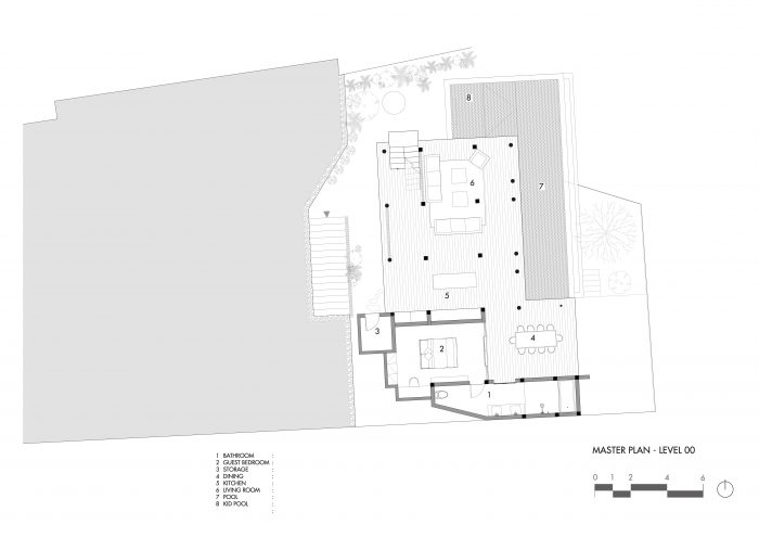 “Rumah Tresna "结合了印尼传统建筑风格和现代设计原则。住宅主楼内有一个大型室外覆盖区,将室内外环境融为一体。设计中的泳池与起居空间融为一体,创造了一个流动的生活环境。周围的大树提供了树荫,有助于室内外的自然冷却。