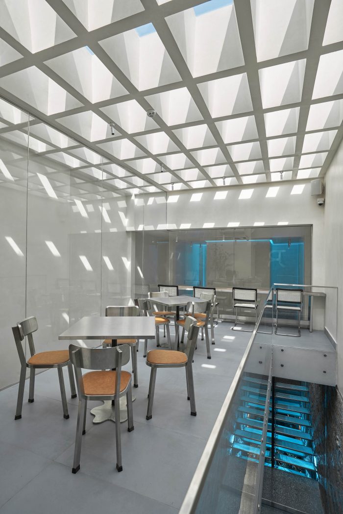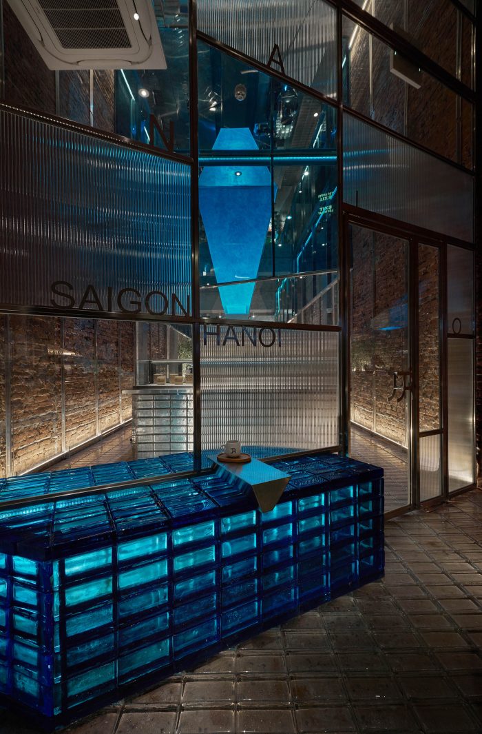 Next, there is a sitting area for 2-3 guests that just want to take a quick sip of coffee. This area uses concrete walls and layers of glass walls to hide the kitchen area and technical area and to make it seem larger. Highlighted with the open ceiling, the atrium is responsible for providing light during the day. The main aisle and the stairs system were made of glass and blue LED light, creating a feeling of walking inside the iceberg. On the first floor, we carefully used arrays of box shapes made from glass, mirror, painted plaster - to integrate multi-material box shape layers on top of each other, making it feel like you are inside the icebox.