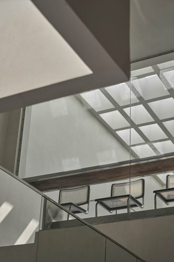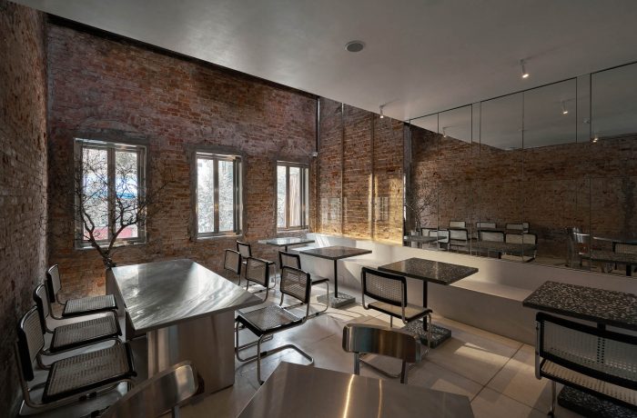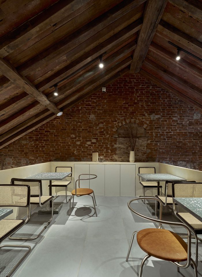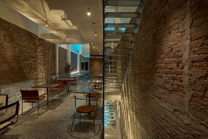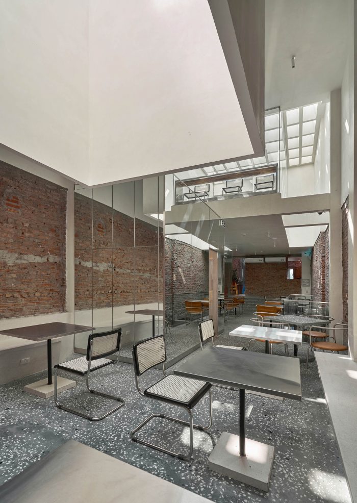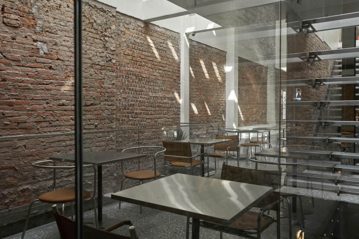 The entire furniture of this project is made of materials that resonate with the space: stainless steel, industrial leather, terrazzo, old wood, and old brick remains of the house.