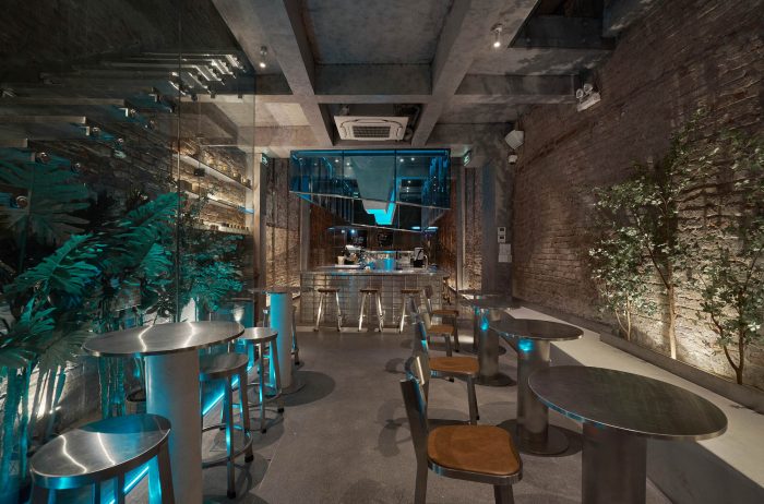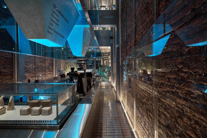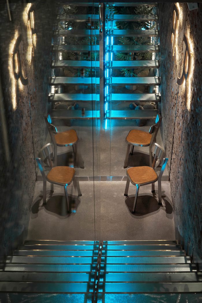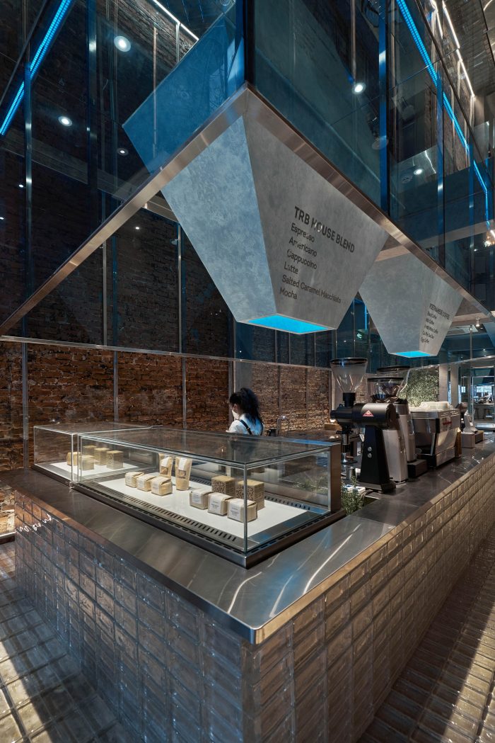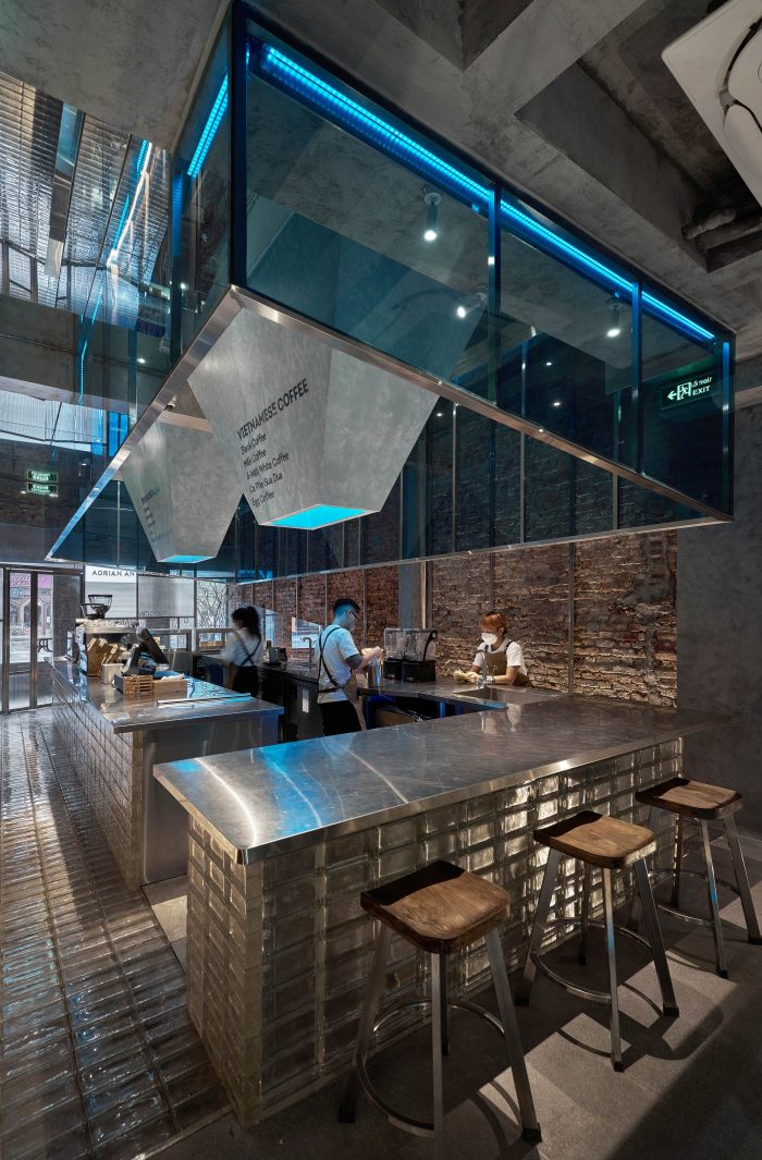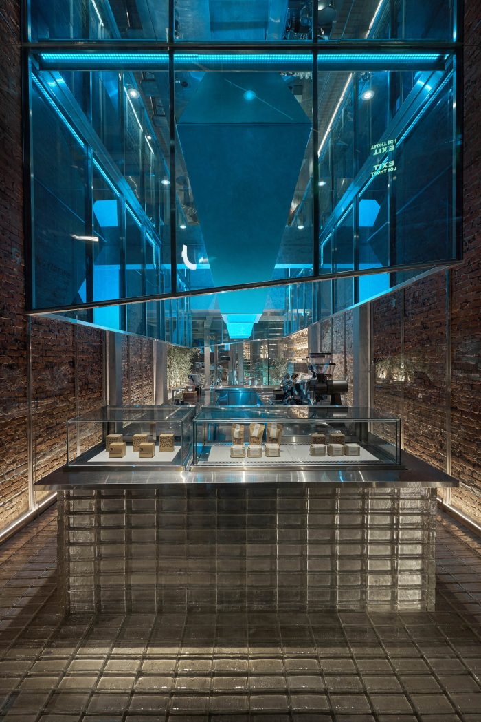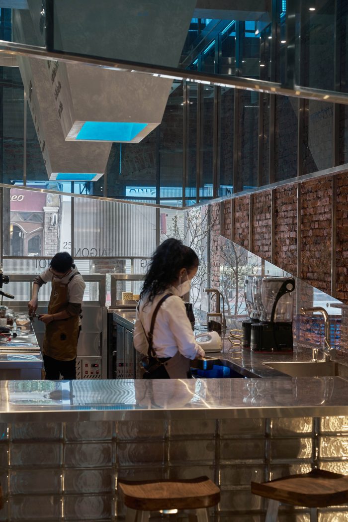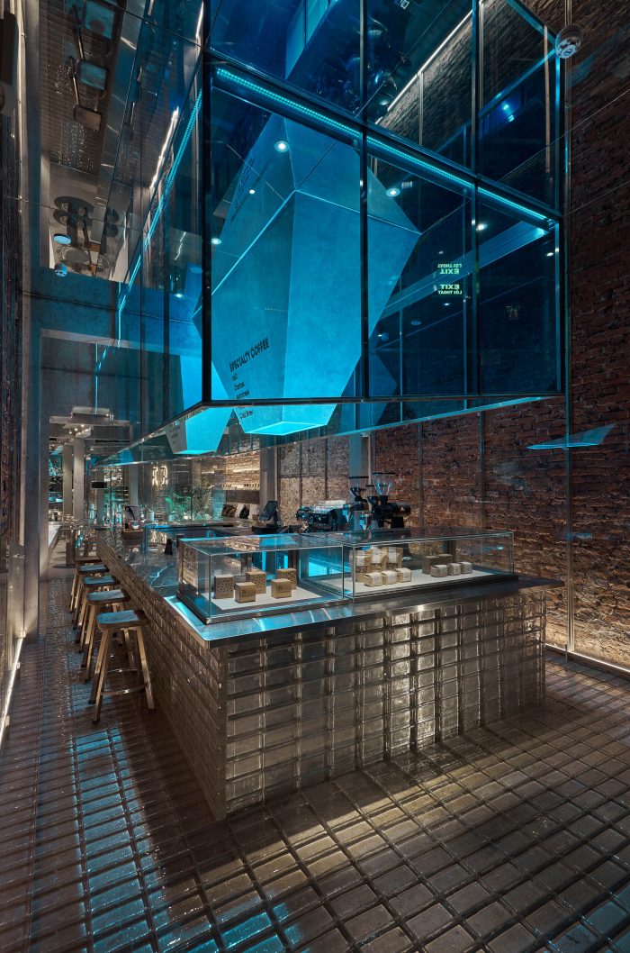At the heart of the ground floor is the open coffee counter, which was made of transparent glass bricks and stainless steel. Above the counter, there is a diagonal rectangular block made of blue glass and stainless steel to strongly resonate with the freezing movement. We removed the finishing mortar layer on both of the sidewalls as well and put an extra layer of beveled glass to match the slanted counter ceiling. Because of the disadvantage of the width, we wanted to increase the original height of the building, which we did by placing an additional layer of mirrors to make it feel higher and airier. To finish it off, the yellow light layer was chosen to be the main light, but we added a layer of blue light inside the counter ceiling to create the color effect and the feel of the iceberg.