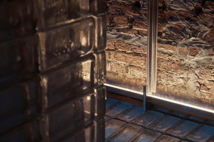 建筑的外墙被剥去了旧的砂浆层,露出了旧的砖墙。哥特式的图案被不锈钢包裹着,使其更具现代感。我们没有直接从正门进入建筑,而是把它推得更深一些,现在的入口大门是由玻璃墙制成的--由两种不同类型的透明和半透明玻璃镶成,创造出透明冰块的形象,里面有切口。在入口处,有一个玻璃砖地板,显示出下面铺设的原始水泥地板。