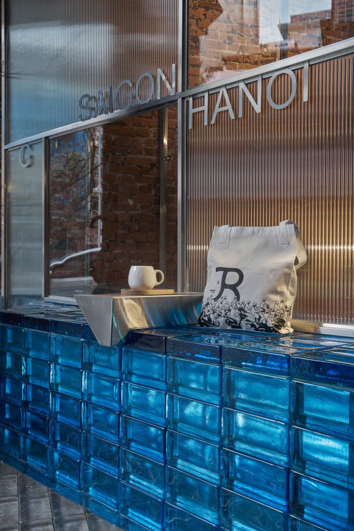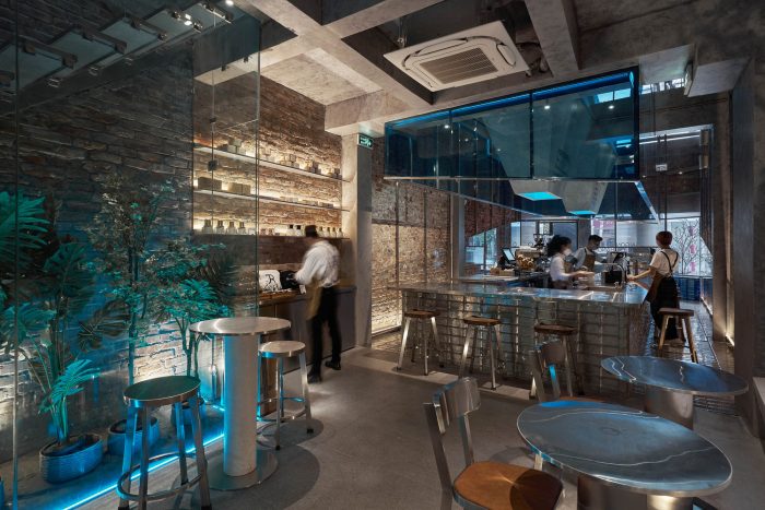 As for the old brick walls, some of them are kept, while the other is combined with the off-white effect wall. In the evening, the entire space is covered with a hue of blue LED light reflecting the feel of the iceberg - the same as the ground floor. Because of the need to enlarge the area and the number of seats required, we changed the structure from two to three floors plus the interwoven mezzanines. The ceiling is pushed up to create spaces for natural light, to overcome the lack of light problem at first.